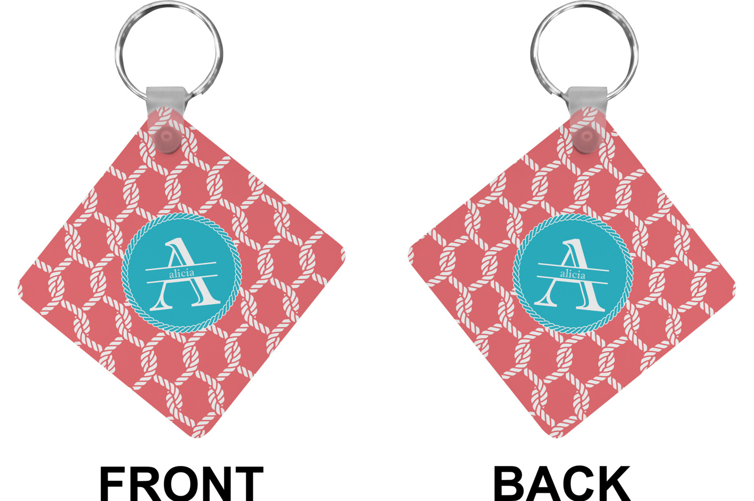 This linked ropes design is perfect for your real or dream beach house. The nautical design has ropes linked together to form diamonds. We have chosen a coral and teal palette for our design. We also chose a rope label and a name initial combination for our personalization.