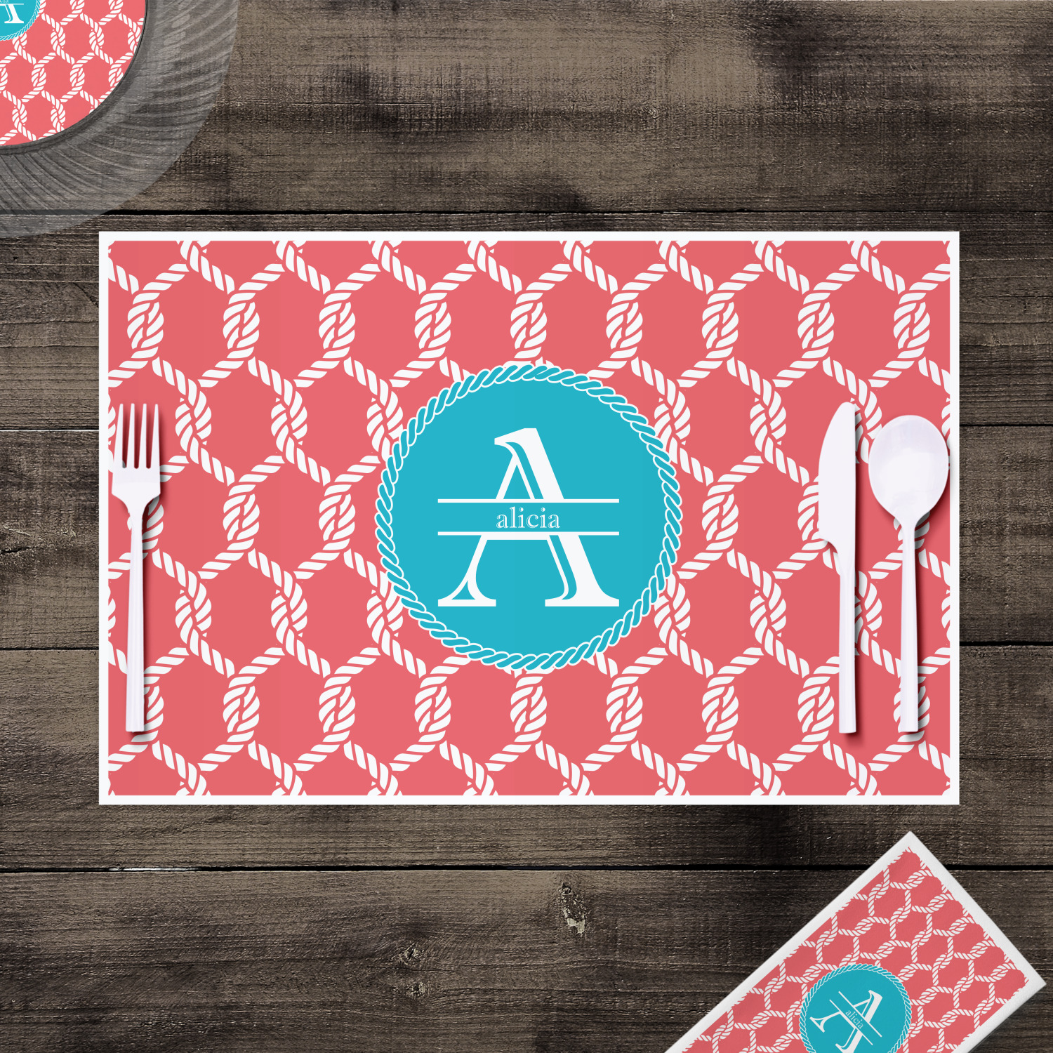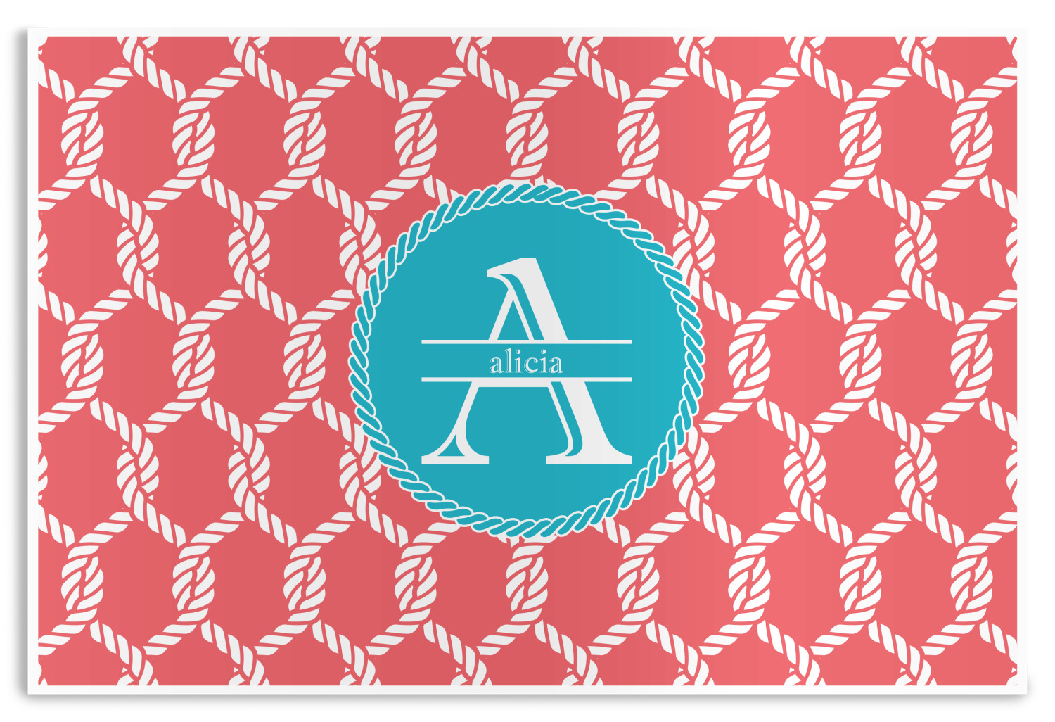 This linked ropes design is perfect for your real or dream beach house. The nautical design has ropes linked together to form diamonds. We have chosen a coral and teal palette for our design. We also chose a rope label and a name initial combination for our personalization.