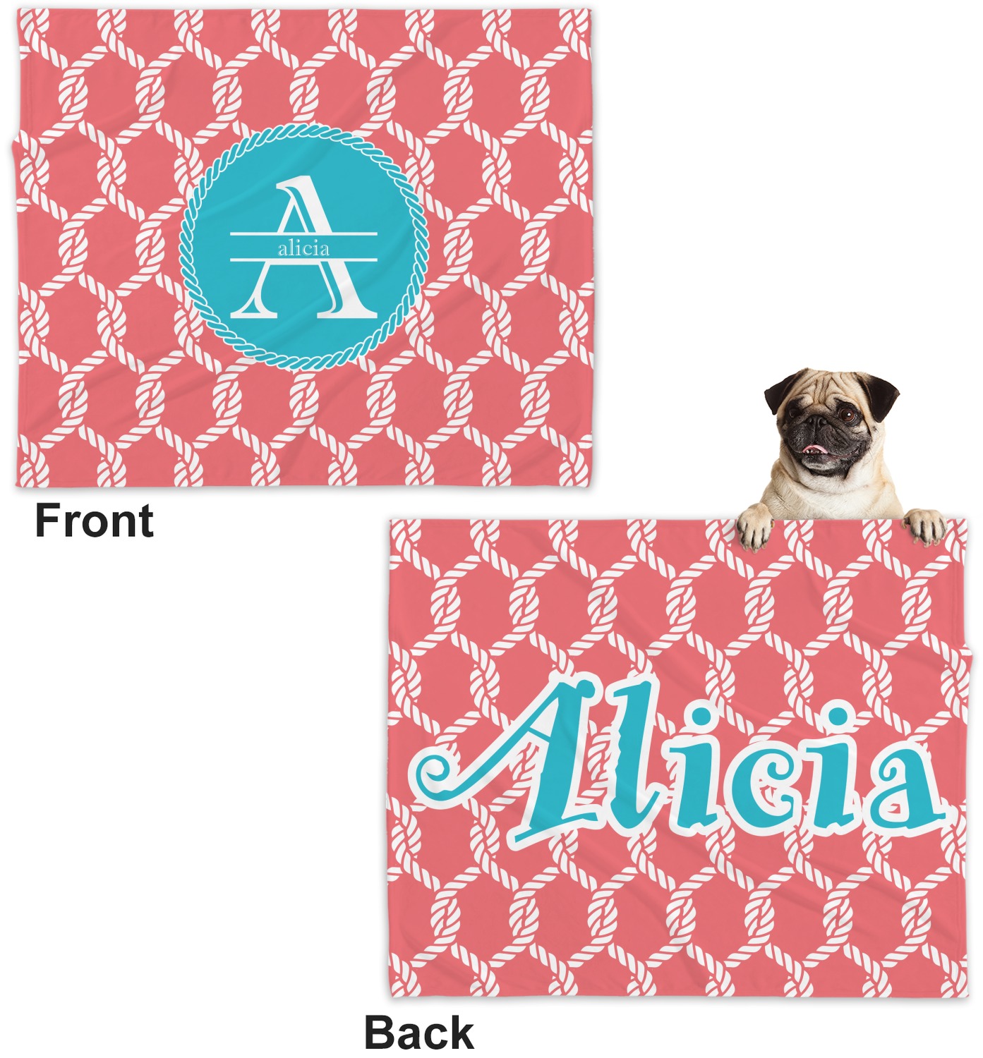 These dog blankets are crafted from a gentle, soft-to-the-touch, minky material. We print your customizations, either matching or differing, on both the top and underside of the blanket. These personalized dog blankets are available in two sizes: regular and large. Our regular size, at 40" x 30", accommodates small and some medium size dogs. At 60" x 50", our large dog blanket is a better fit for bigger breeds. Though specialized for dogs, these blankets still make a thoughtful gift for your favorite feline, or any other pet in mind!