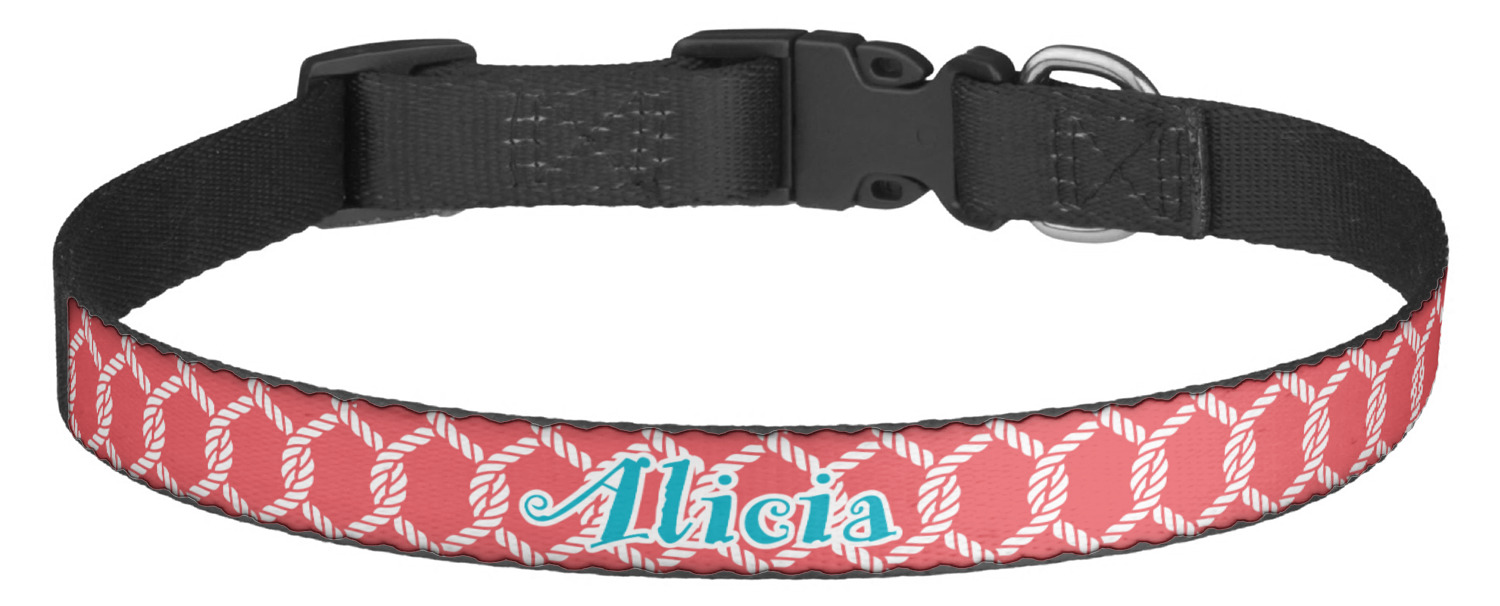 This sturdy collar, made from a durable nylon weave, will outlive your dog's episodes of excited tugging and pulling. Courtesy of its thick plastic buckle and adjuster, this collar is adjustable and accommodating of any dog. Structurally, the collar is a single piece of nylon weave that is sewn together, and features a solid metal loop where you can attach a leash or dog tag. We print and display your dog's name and pattern across the middle of the personalized dog collar.