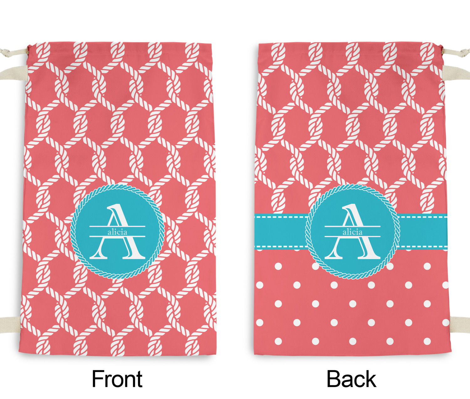 This linked ropes design is perfect for your real or dream beach house. The nautical design has ropes linked together to form diamonds. We have chosen a coral and teal palette for our design. We also chose a rope label and a name initial combination for our personalization.
