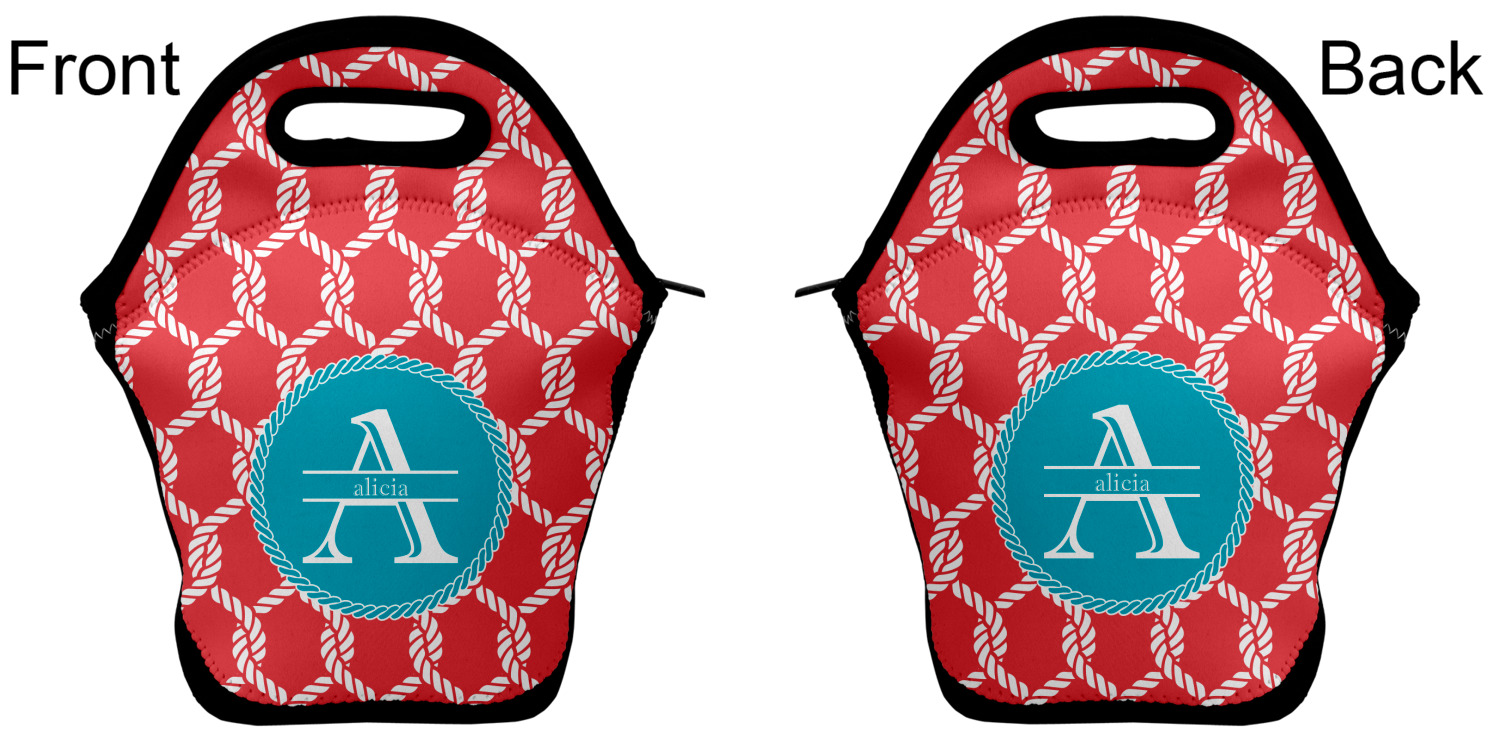 Our personalized lunch bags are made from a strong neoprene, and secure with a zipper closure that lines the top of the bag.The edges of the neoprene are sewn together with a heavy duty stitch, adding to the durability of the bag. The is accompanied by a reinforced handle at its top, for the easy transport of your lunch. We display your personalization across both the front and back of this neoprene lunch bag, while the remaining sides are a sleek black in color. Each bag measures at 13.5 inches tall, and 11.5 inches wide.