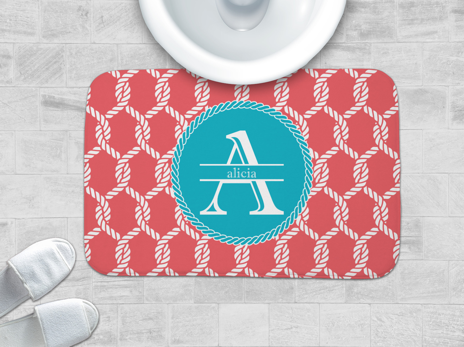 This linked ropes design is perfect for your real or dream beach house. The nautical design has ropes linked together to form diamonds. We have chosen a coral and teal palette for our design. We also chose a rope label and a name initial combination for our personalization.