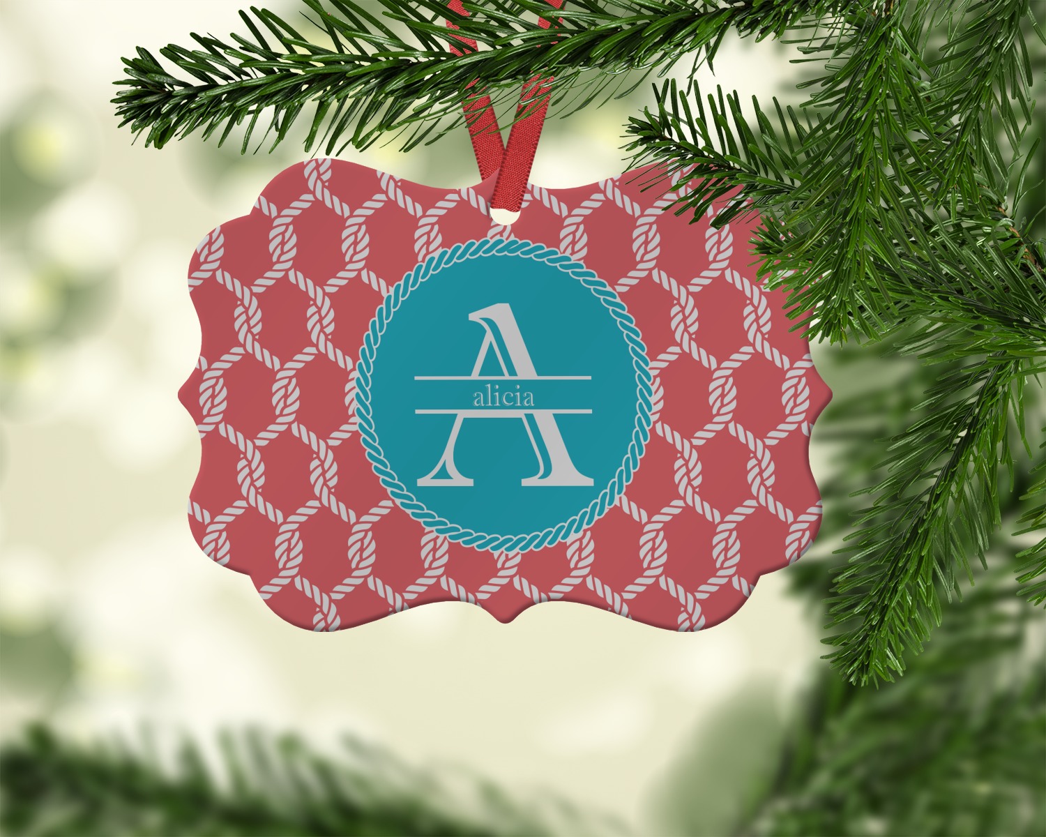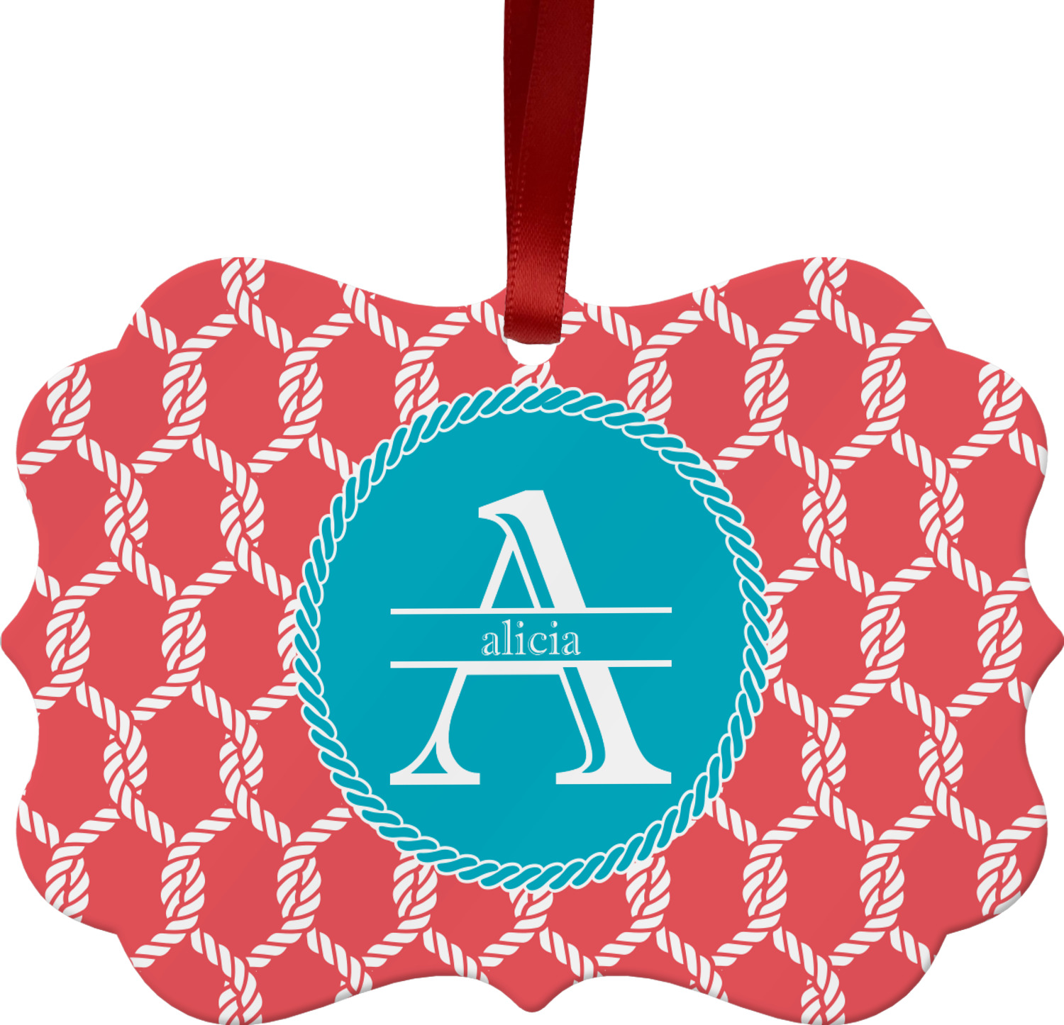 This linked ropes design is perfect for your real or dream beach house. The nautical design has ropes linked together to form diamonds. We have chosen a coral and teal palette for our design. We also chose a rope label and a name initial combination for our personalization.