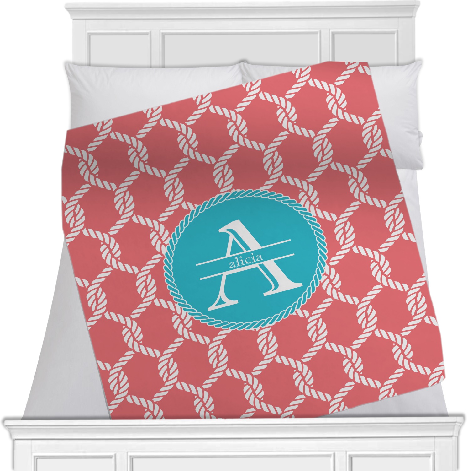 This linked ropes design is perfect for your real or dream beach house. The nautical design has ropes linked together to form diamonds. We have chosen a coral and teal palette for our design. We also chose a rope label and a name initial combination for our personalization.