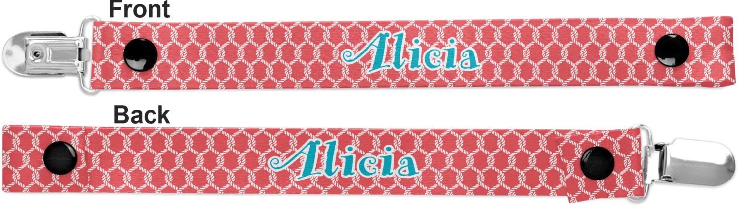 This personalized pacifier clip is the ideal size and measures at approximately 7.5 inches in length, when either end is snapped closed. On one end, you'll find a snap button. This button of your baby's pacifier holder is what can be attached to their pacifier to hold is securely in place. Simply open the snap, slip it through the pacifier opening, and snap it back into place. On the opposite end of this baby pacifier holder, you'll find a metal clip that can secure to a baby's collar or sleeve. This clip ensures that the strap stays in place, and that your baby's pacifier is always on hand.