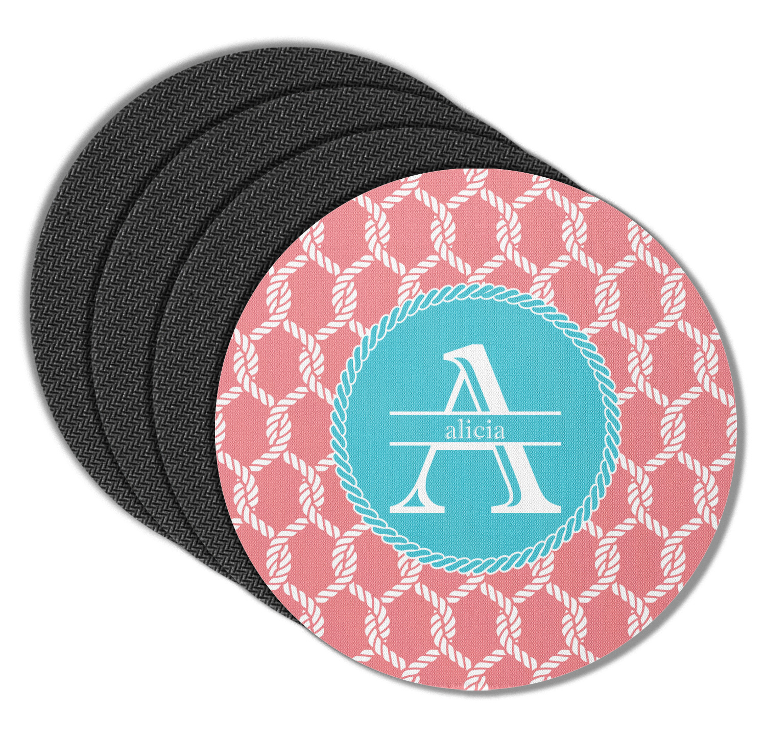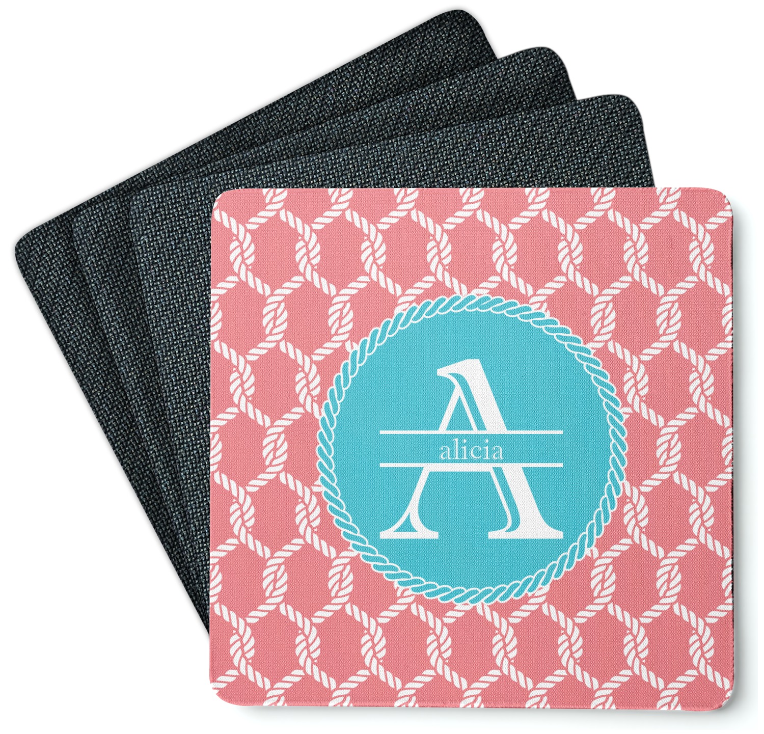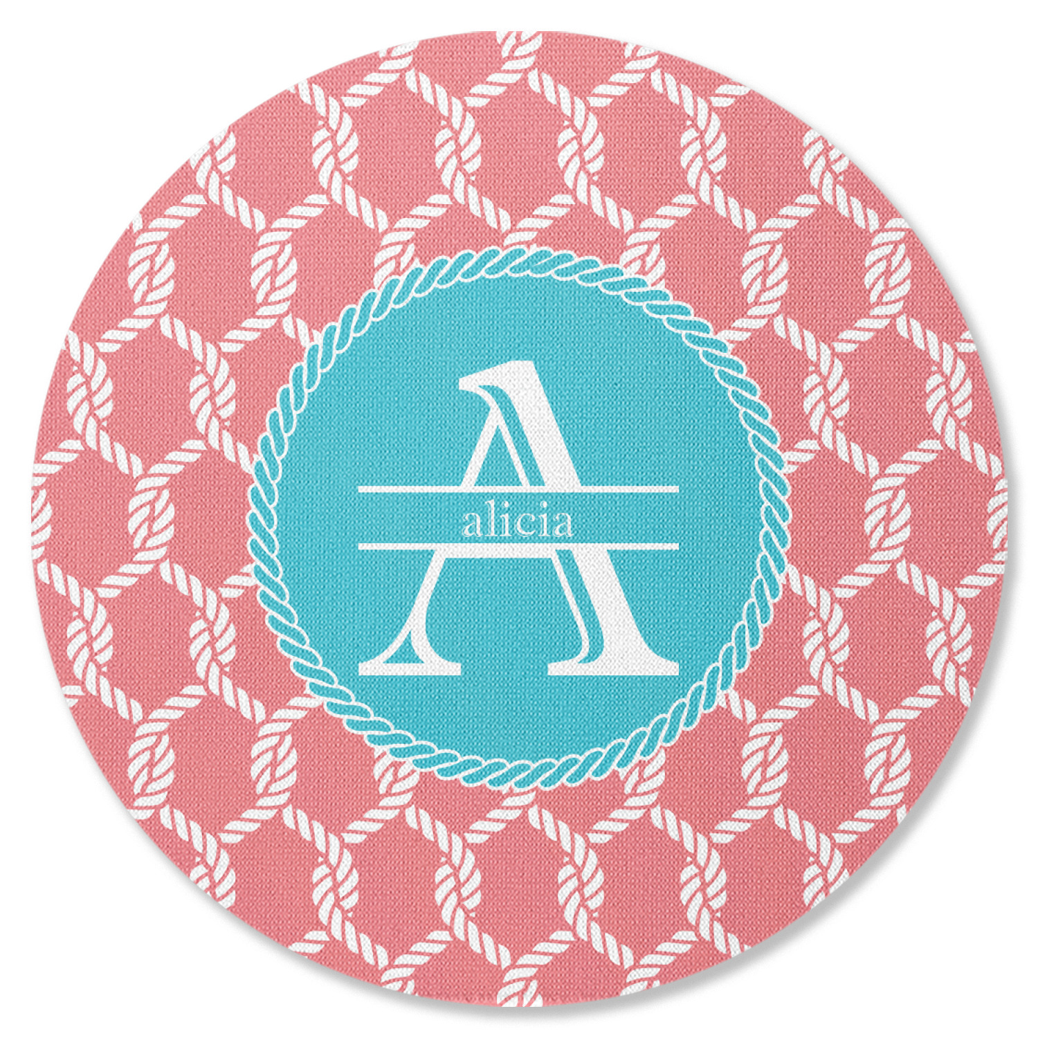 This linked ropes design is perfect for your real or dream beach house. The nautical design has ropes linked together to form diamonds. We have chosen a coral and teal palette for our design. We also chose a rope label and a name initial combination for our personalization.