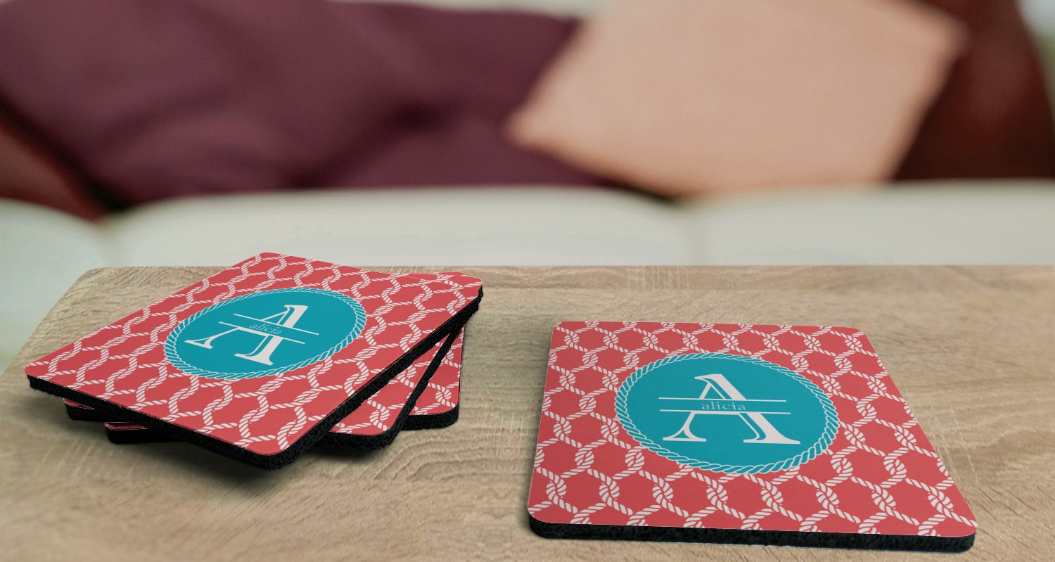 These drink coasters have a smooth, polyester top and a textured, rubber backing on its bottom. The non-slip rubber backing underneath works to keep any spills at bay. At 4 by 4 by 0.25 inches thick, these custom coasters are a suitable size for most drinkware. Your personalization is displayed atop the face of the cup coaster. We sell these rubber coasters in two different shapes: square and round. You can buy each shape as singulars or as a set of 4.