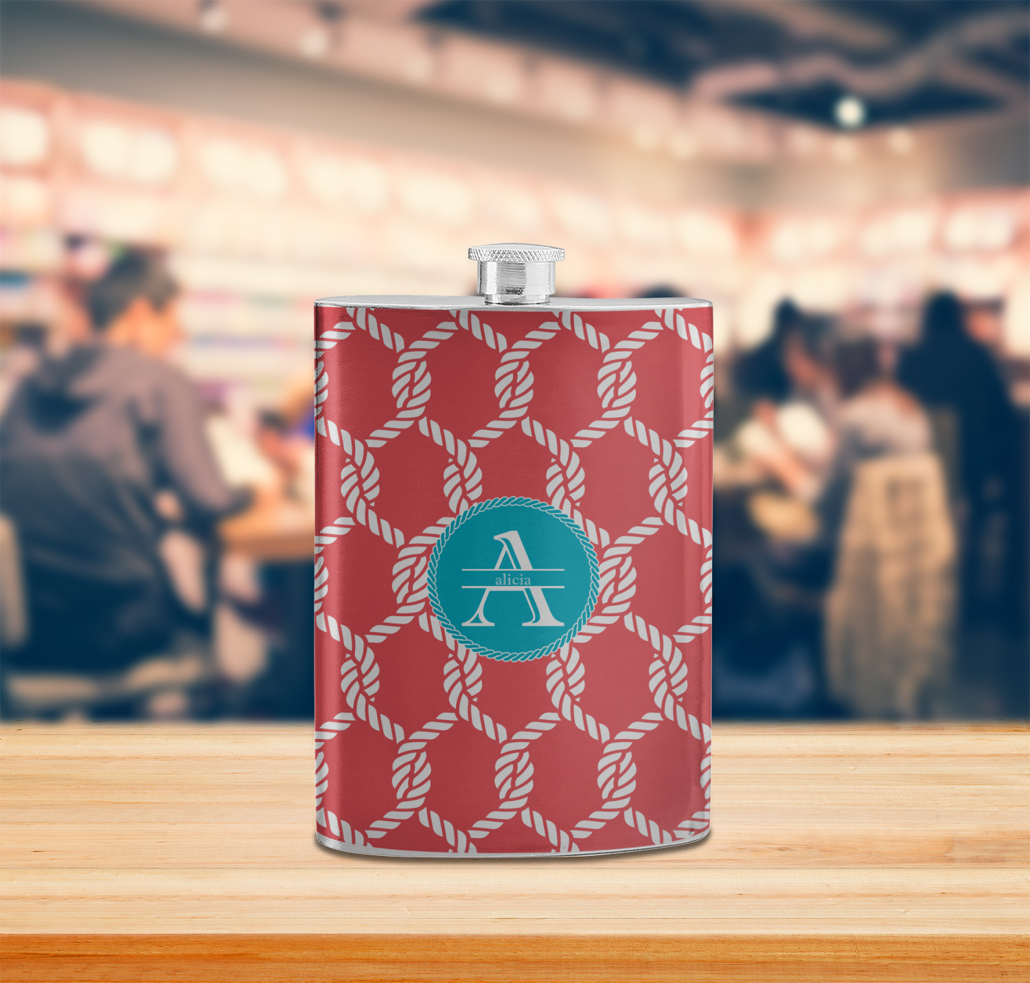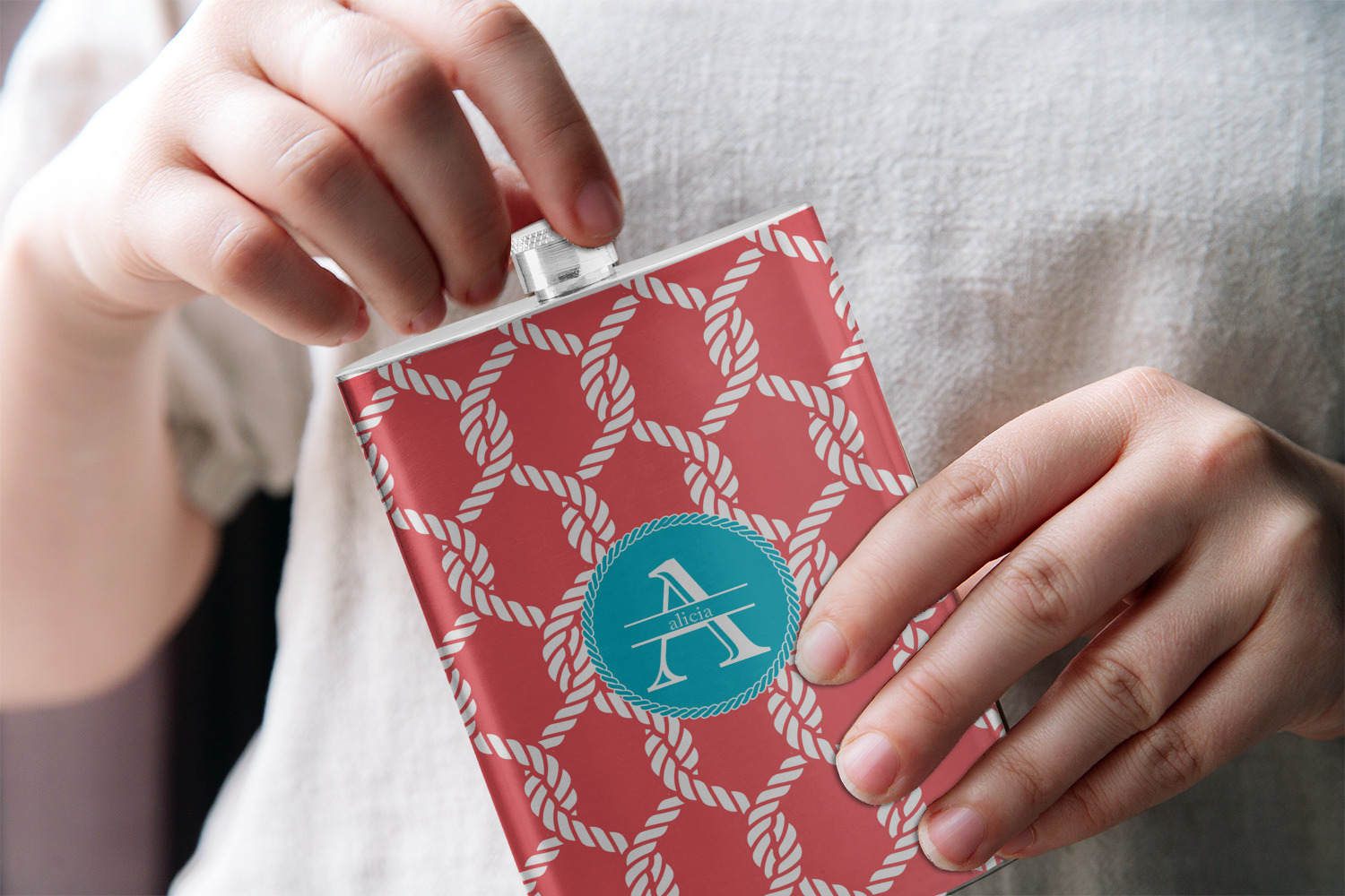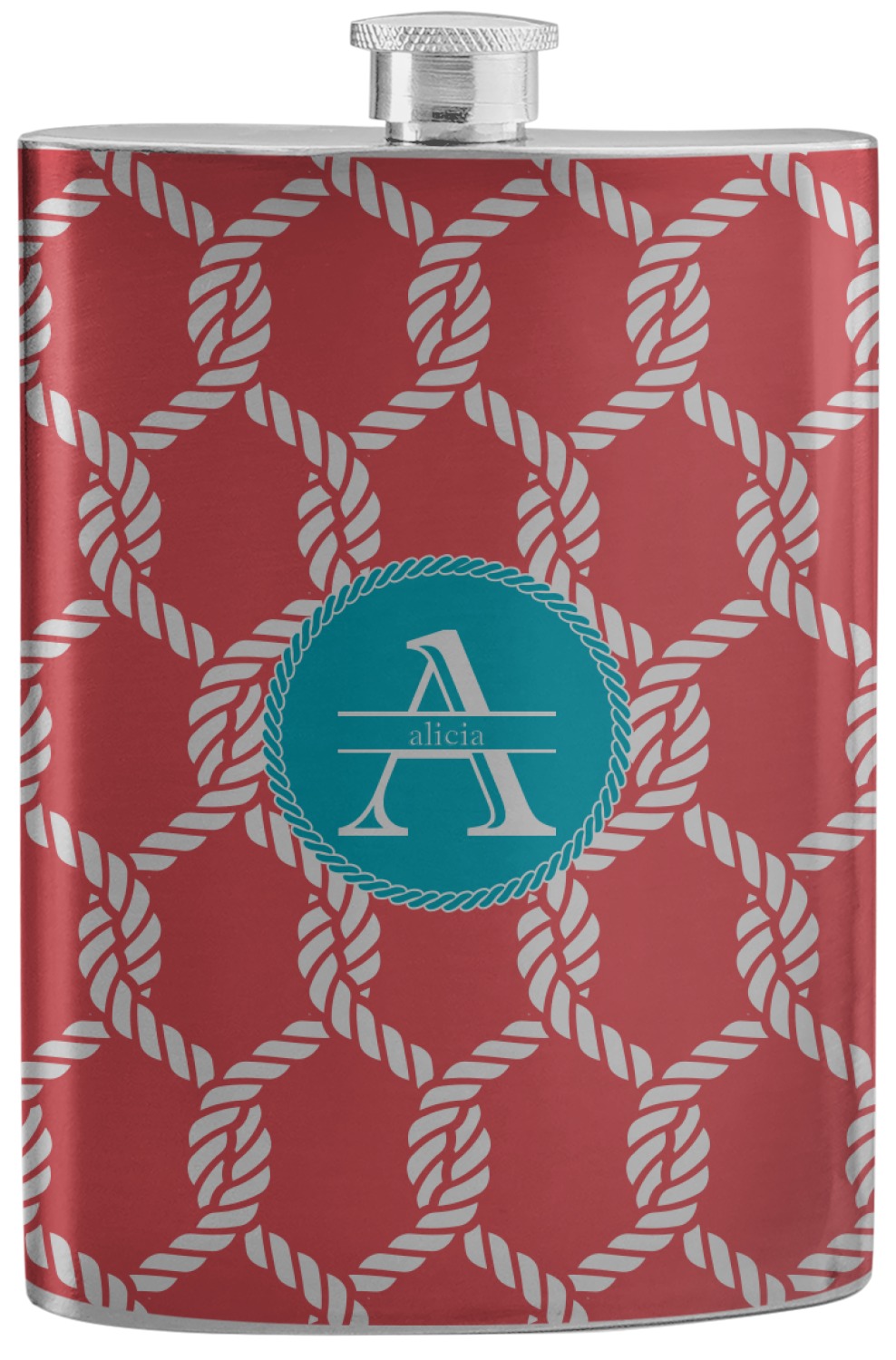 This linked ropes design is perfect for your real or dream beach house. The nautical design has ropes linked together to form diamonds. We have chosen a coral and teal palette for our design. We also chose a rope label and a name initial combination for our personalization.