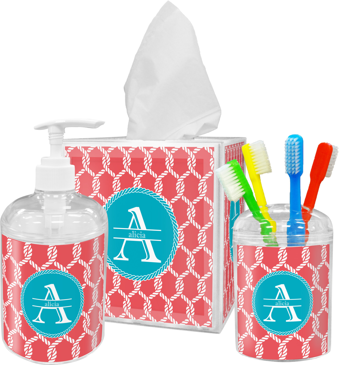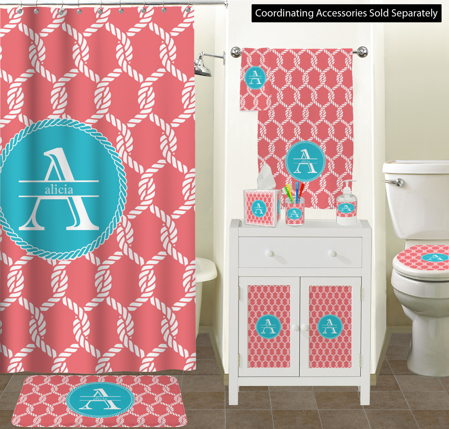 This linked ropes design is perfect for your real or dream beach house. The nautical design has ropes linked together to form diamonds. We have chosen a coral and teal palette for our design. We also chose a rope label and a name initial combination for our personalization.