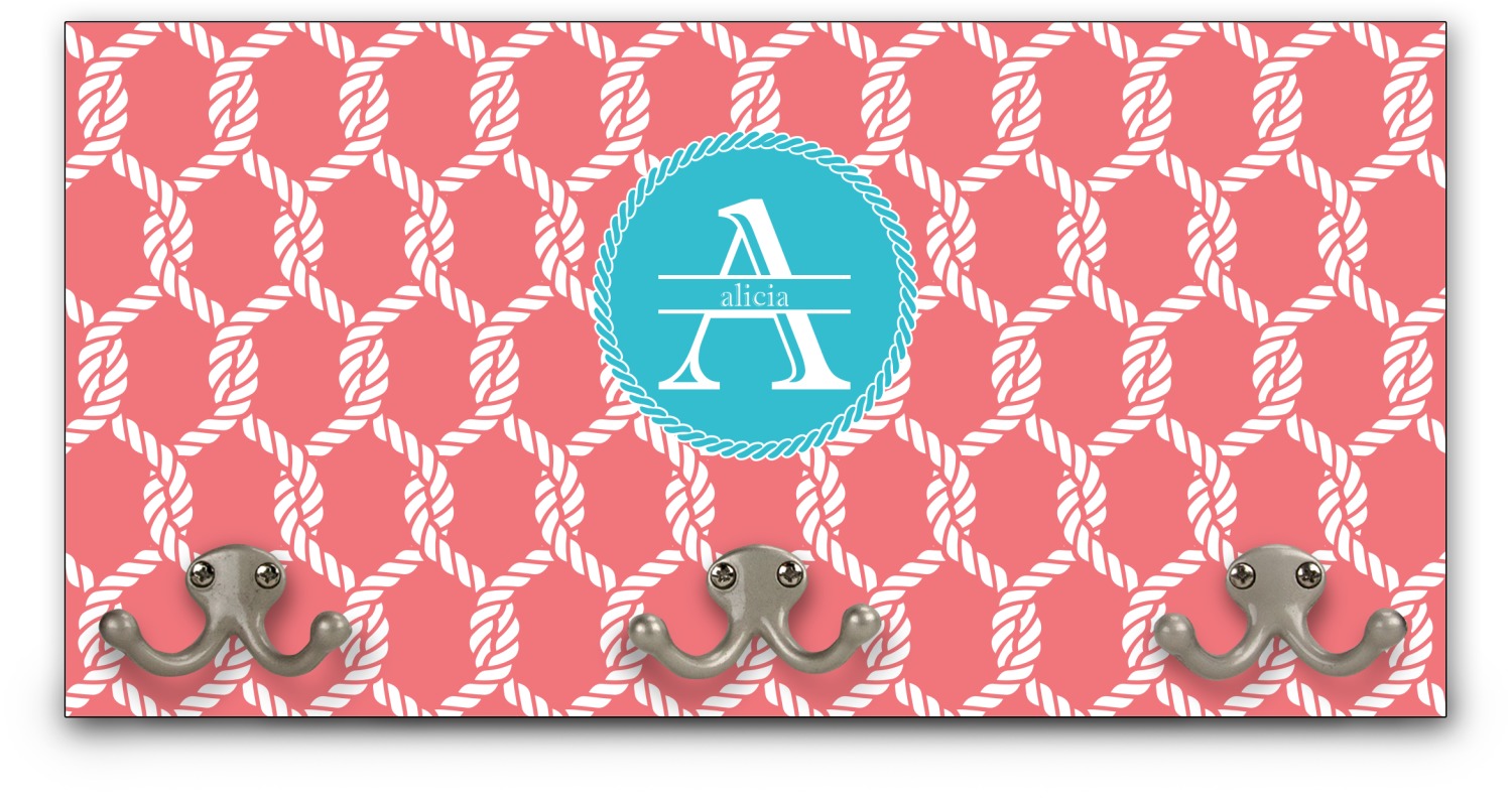 This linked ropes design is perfect for your real or dream beach house. The nautical design has ropes linked together to form diamonds. We have chosen a coral and teal palette for our design. We also chose a rope label and a name initial combination for our personalization.