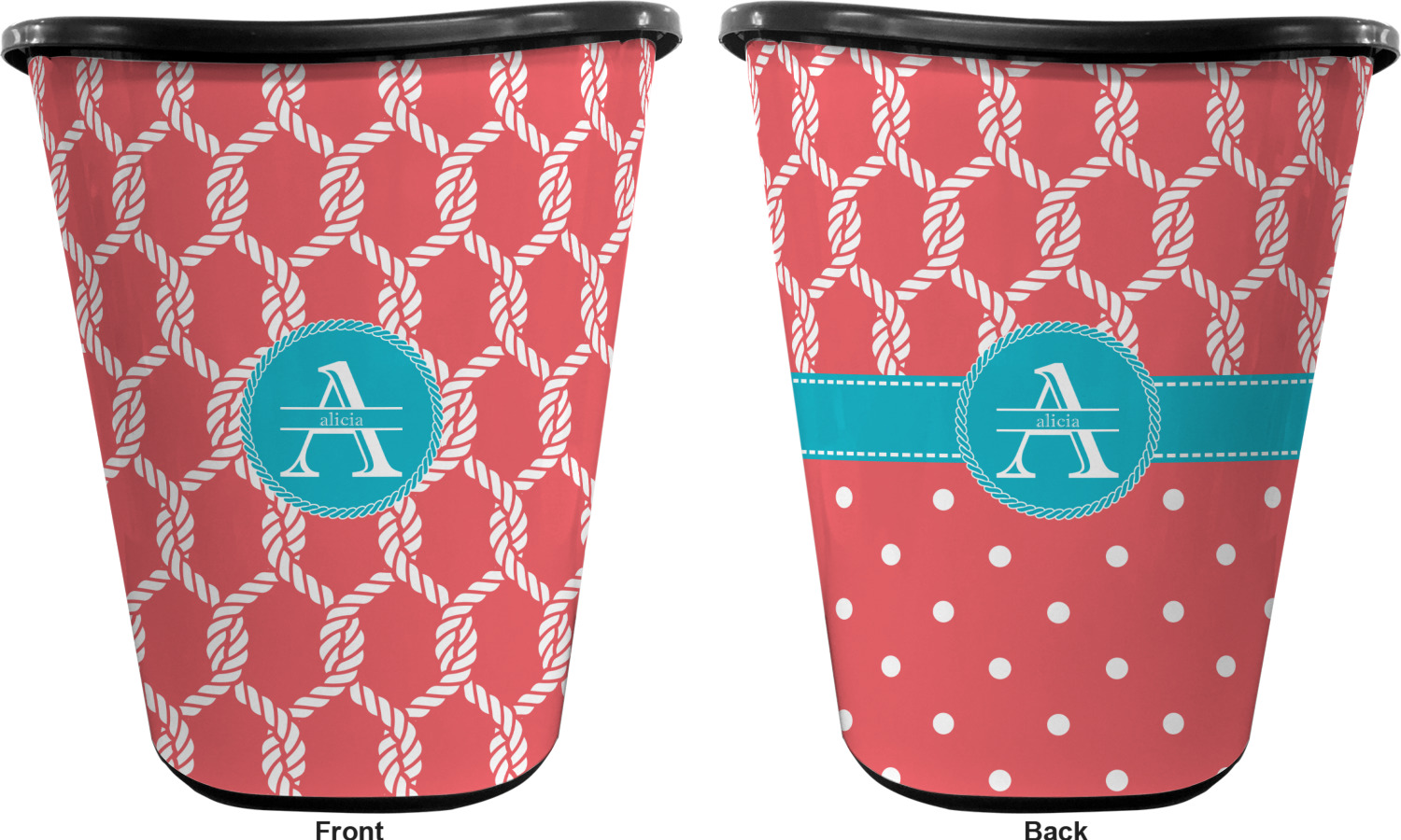 You can choose to purchase these decorative wastebaskets in either a white or a black color that will show on the base and the upper rim. Your customization is printed on a high-gloss, fine-quality vinyl adhesive, and you can choose to either have this adhesive applied to one side only or to both sides. As such, this plastic wastebasket can be single-sided or double-sided, depending on your creative vision. Your customization is printed using durable inks, making the design waterproof and resistant to fading over time.