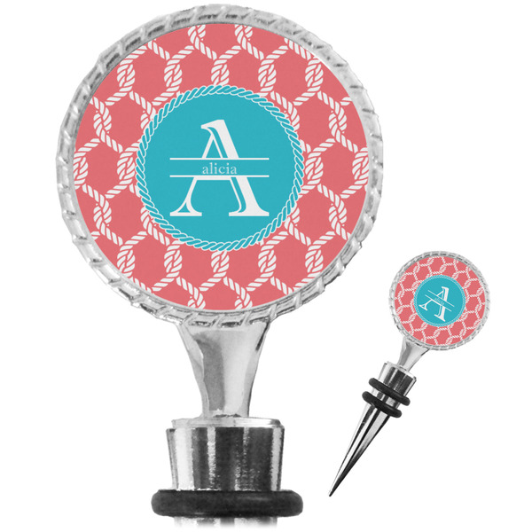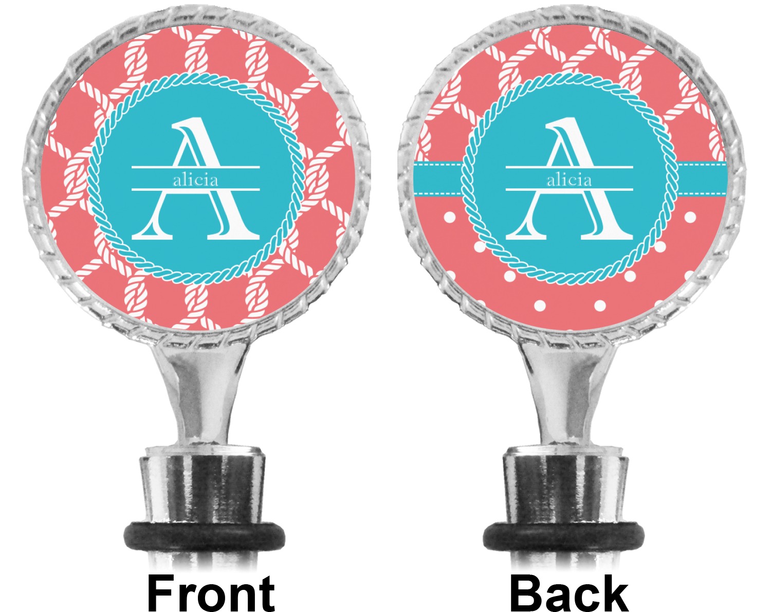 The top part of your bottle stopper is comprised of a zinc ring that displays your customization(s) in its middle, on both sides. The ring is heavy duty, with a bright chrome finish. The body of the wine stoppers have two silicone rings to provide an airtight seal. These wine bottle stoppers measure at 1.625" L x 0.8125" W x 4.625" H; your custom wine stopper is meant to fit into most standard-sized wine bottles.