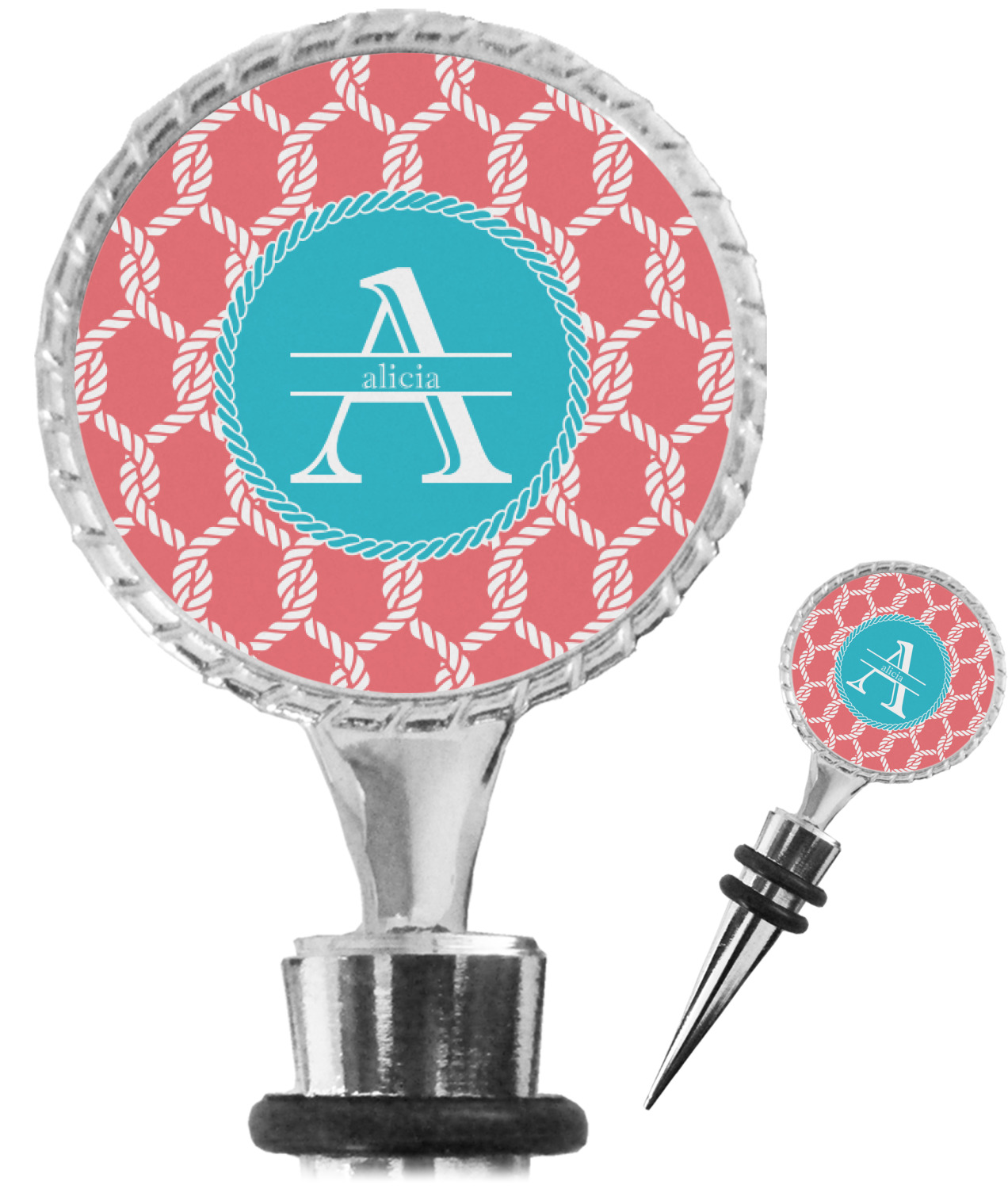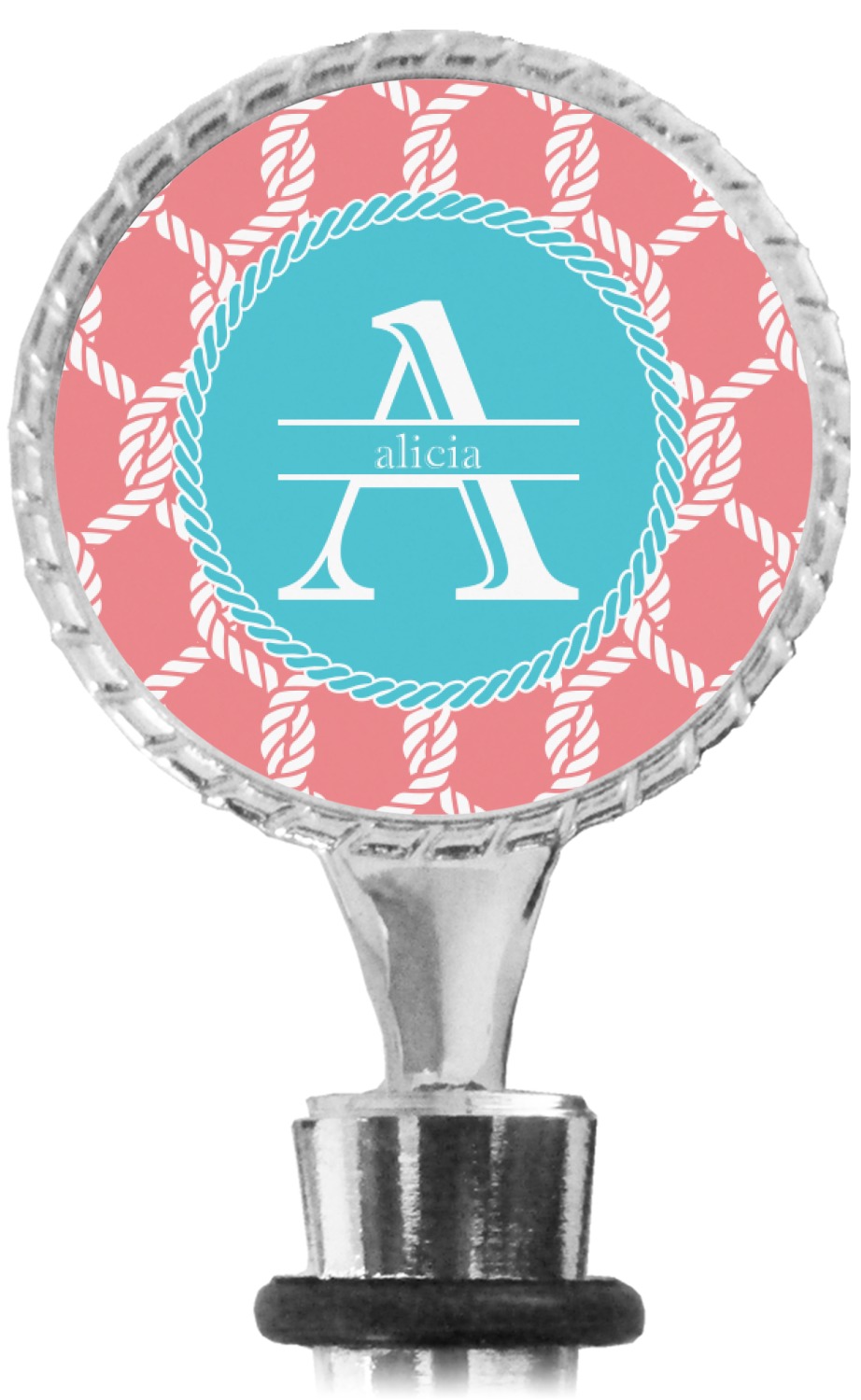 This linked ropes design is perfect for your real or dream beach house. The nautical design has ropes linked together to form diamonds. We have chosen a coral and teal palette for our design. We also chose a rope label and a name initial combination for our personalization.