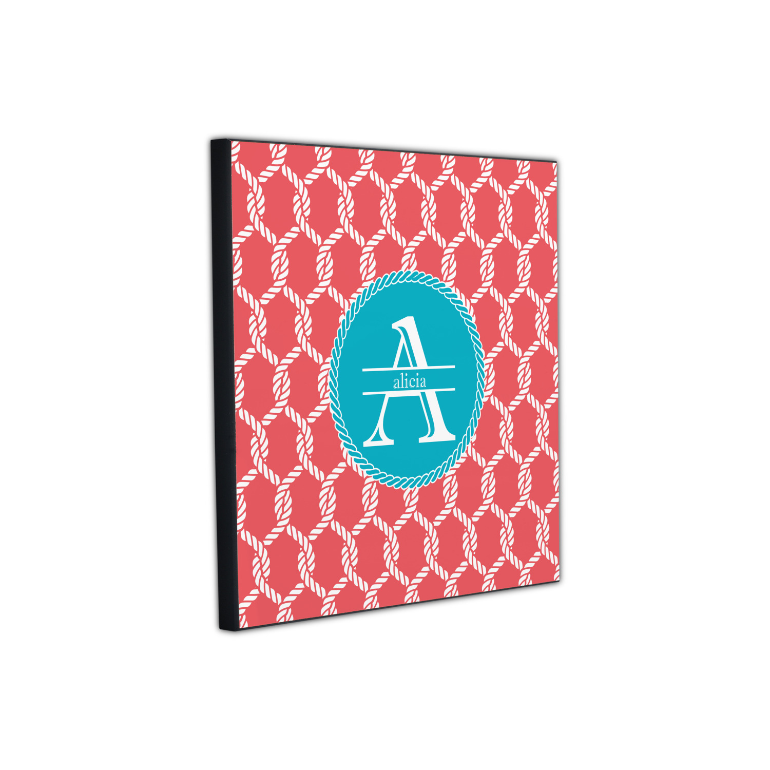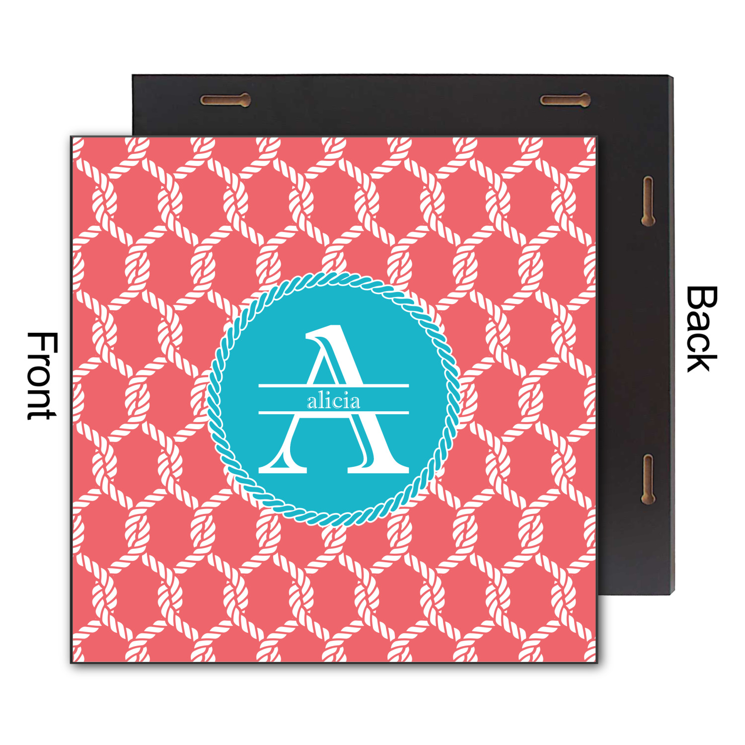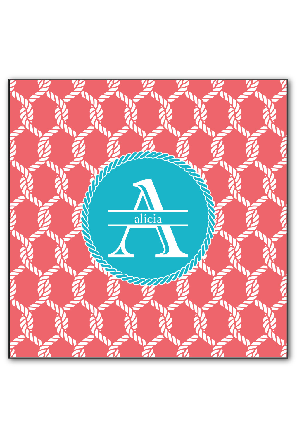 This linked ropes design is perfect for your real or dream beach house. The nautical design has ropes linked together to form diamonds. We have chosen a coral and teal palette for our design. We also chose a rope label and a name initial combination for our personalization.