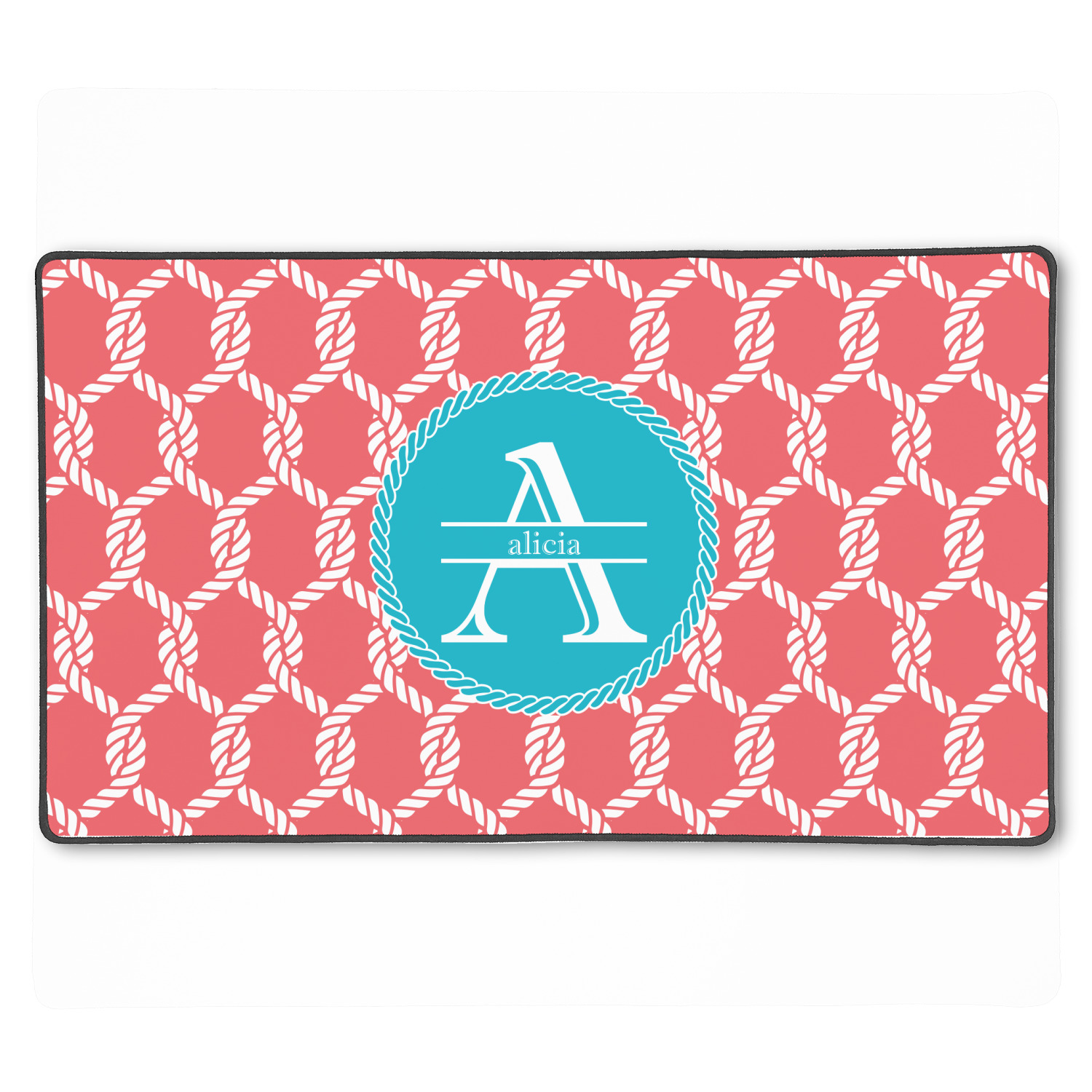 This linked ropes design is perfect for your real or dream beach house. The nautical design has ropes linked together to form diamonds. We have chosen a coral and teal palette for our design. We also chose a rope label and a name initial combination for our personalization.