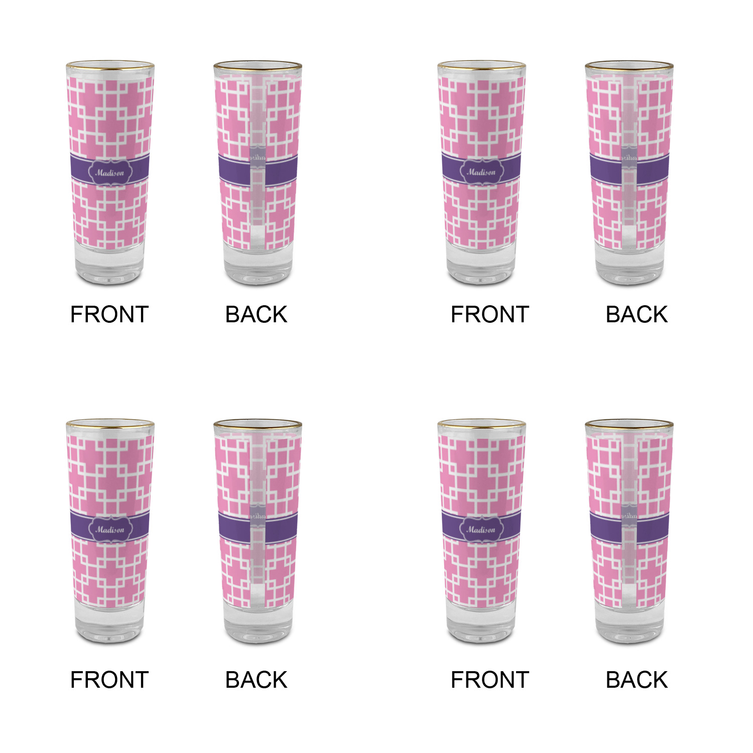 These glass shooter glasses are printed in full color with the design of your choice. These are a tall shooter 2 oz size and stand 4" tall. The print is a full wrap design to boldly display your personalization.