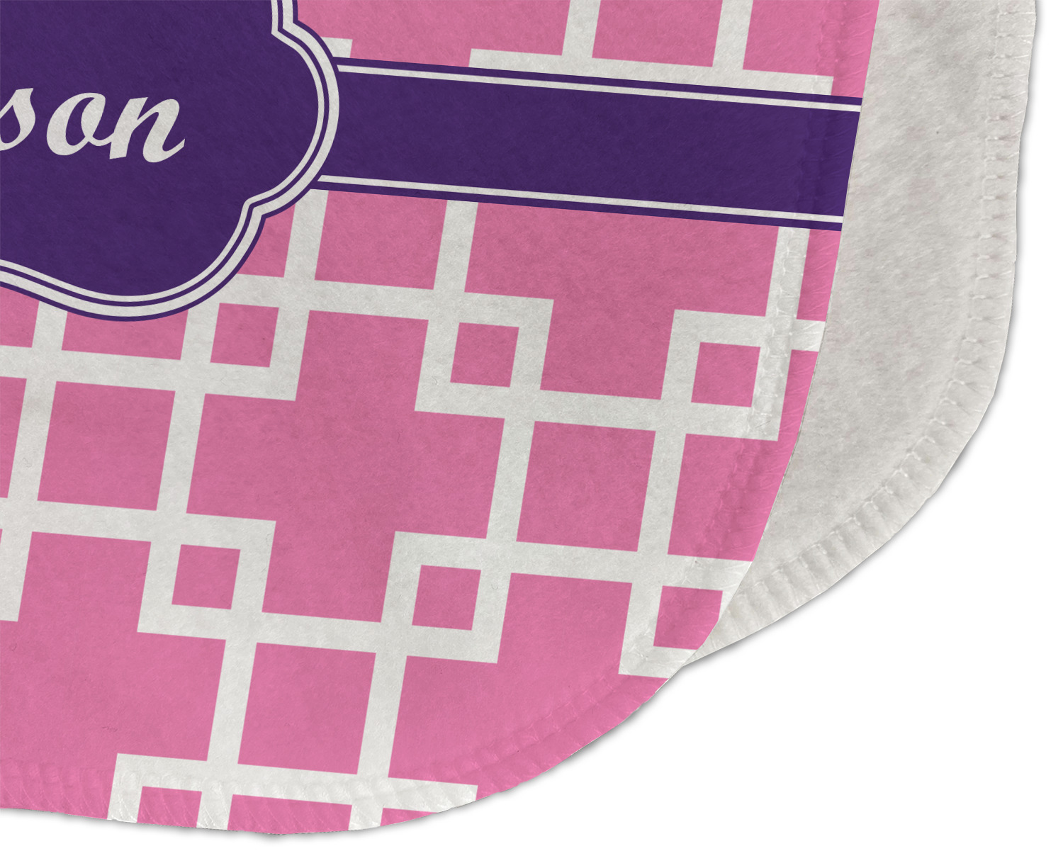 This design that is shown is a pink background with white squares, however it is available in multiple colors. We also chose to use a classic ribbon and a decorative rectangular label in purple. Ribbon and Labels are also available in multiple colors.