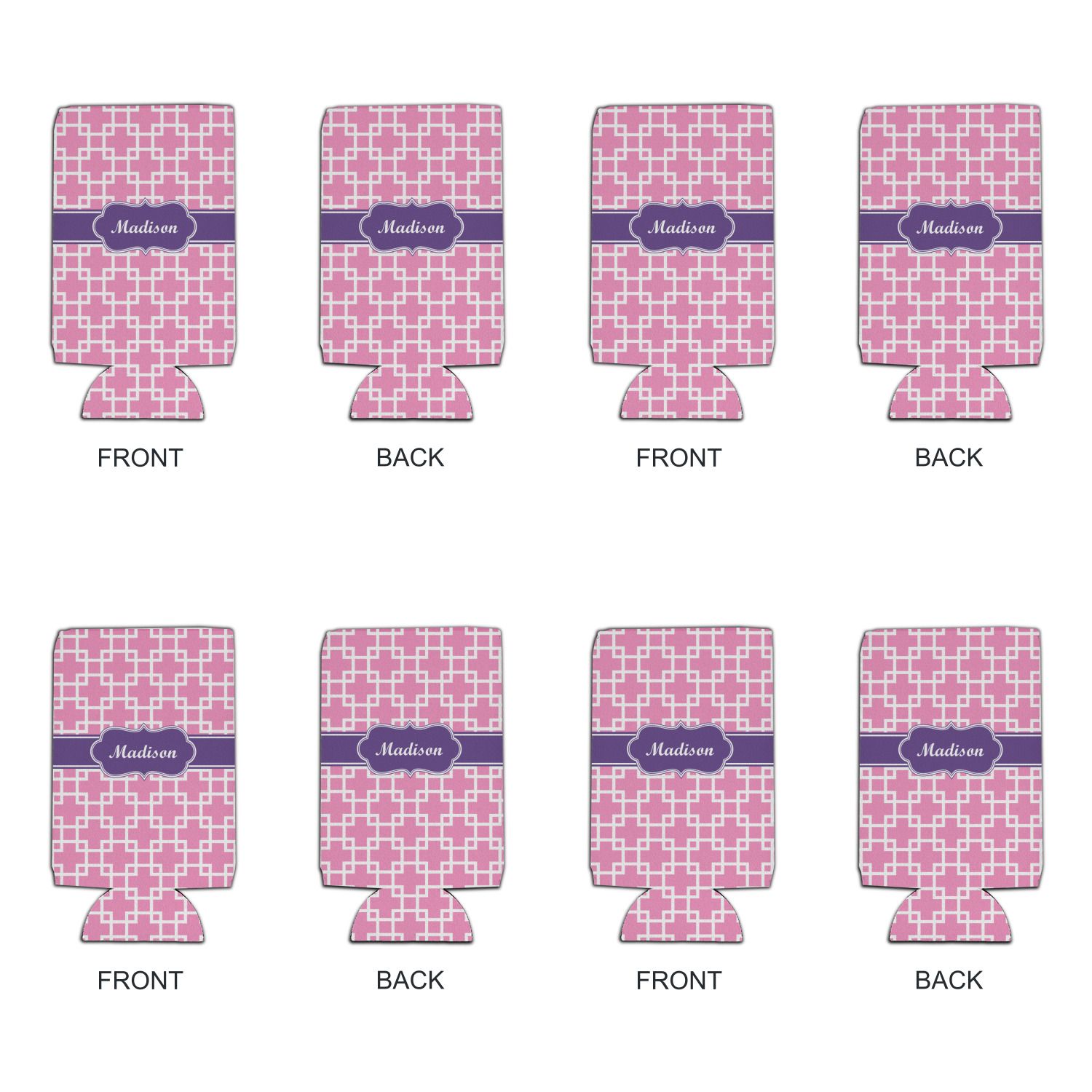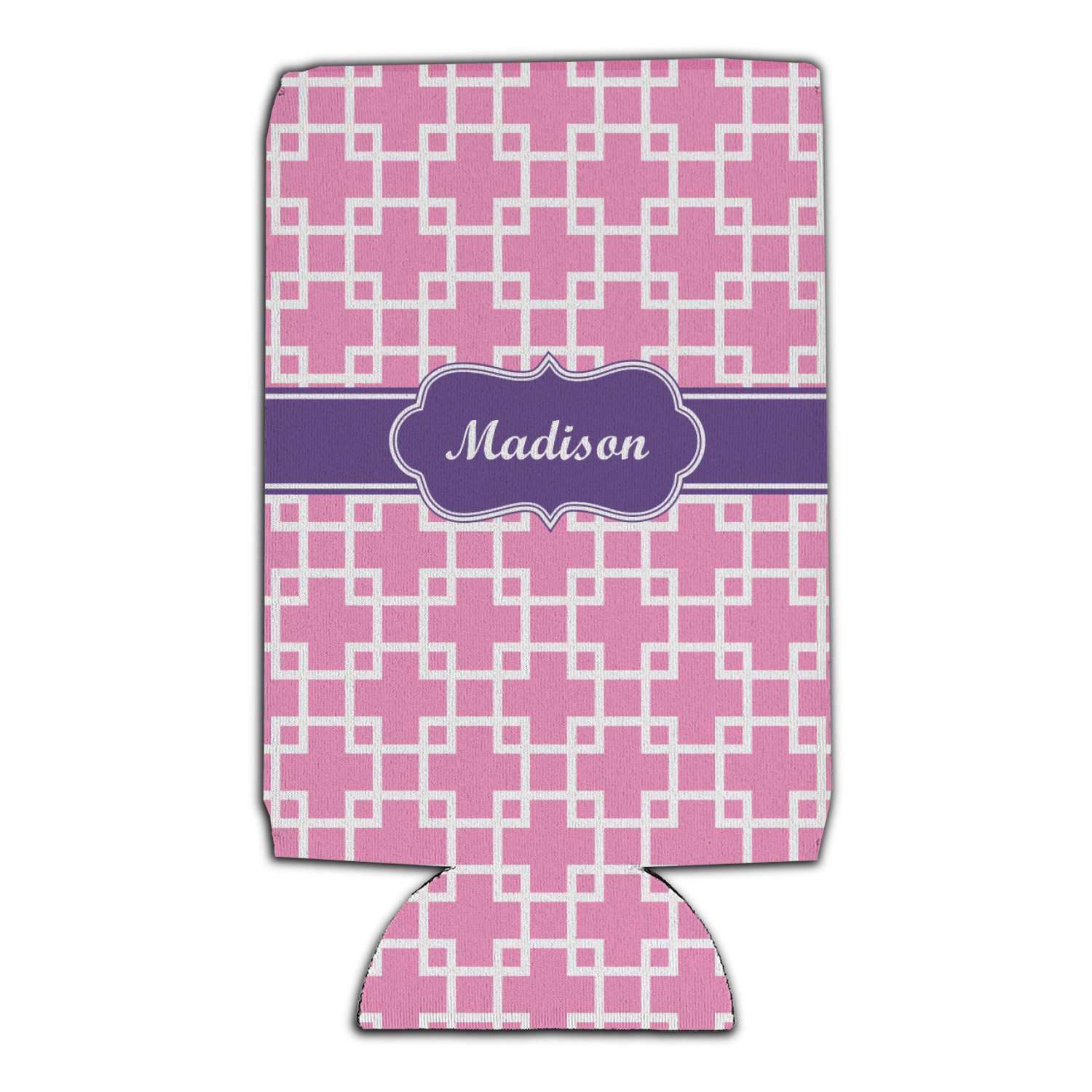 This design that is shown is a pink background with white squares, however it is available in multiple colors. We also chose to use a classic ribbon and a decorative rectangular label in purple. Ribbon and Labels are also available in multiple colors.