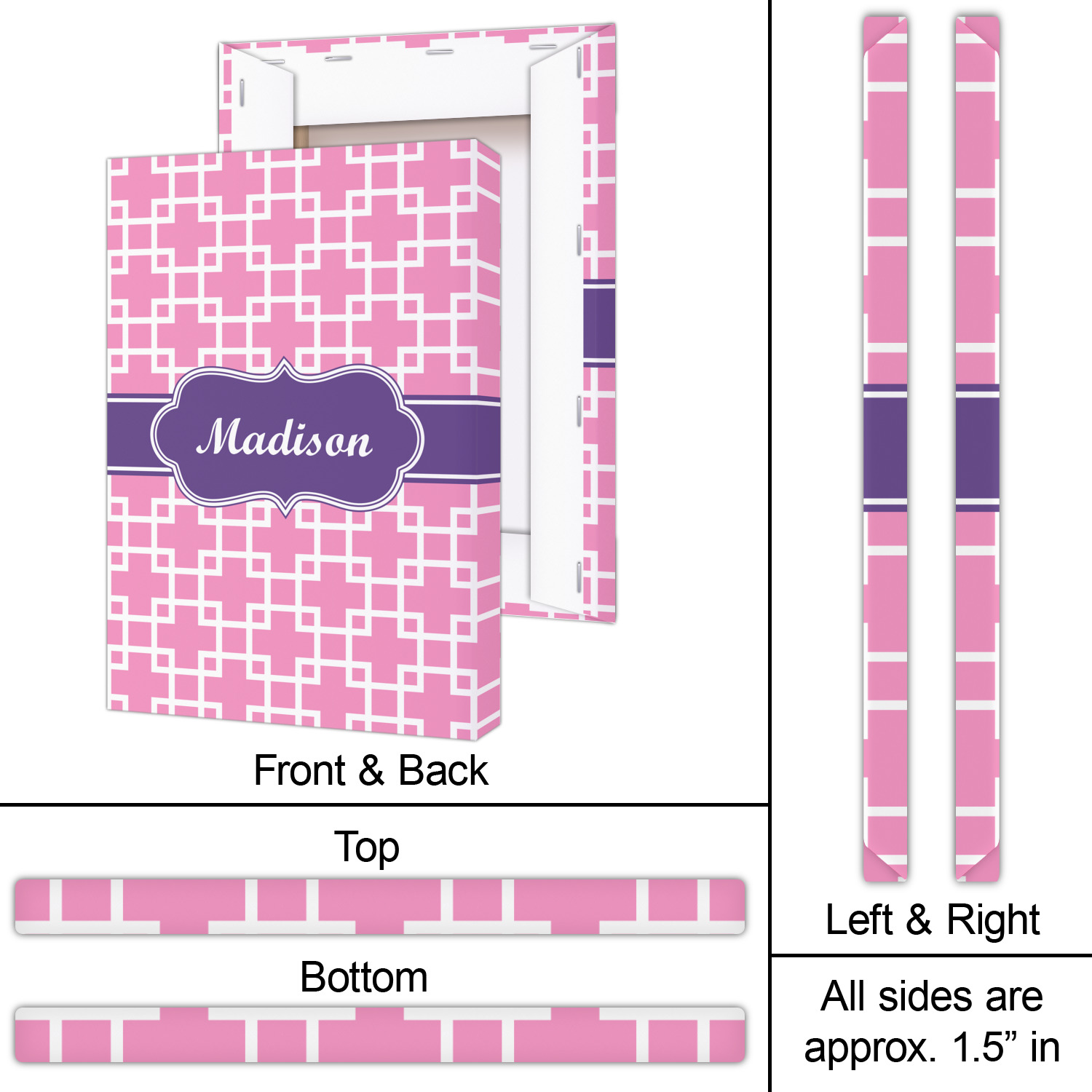 This design that is shown is a pink background with white squares, however it is available in multiple colors. We also chose to use a classic ribbon and a decorative rectangular label in purple. Ribbon and Labels are also available in multiple colors.
