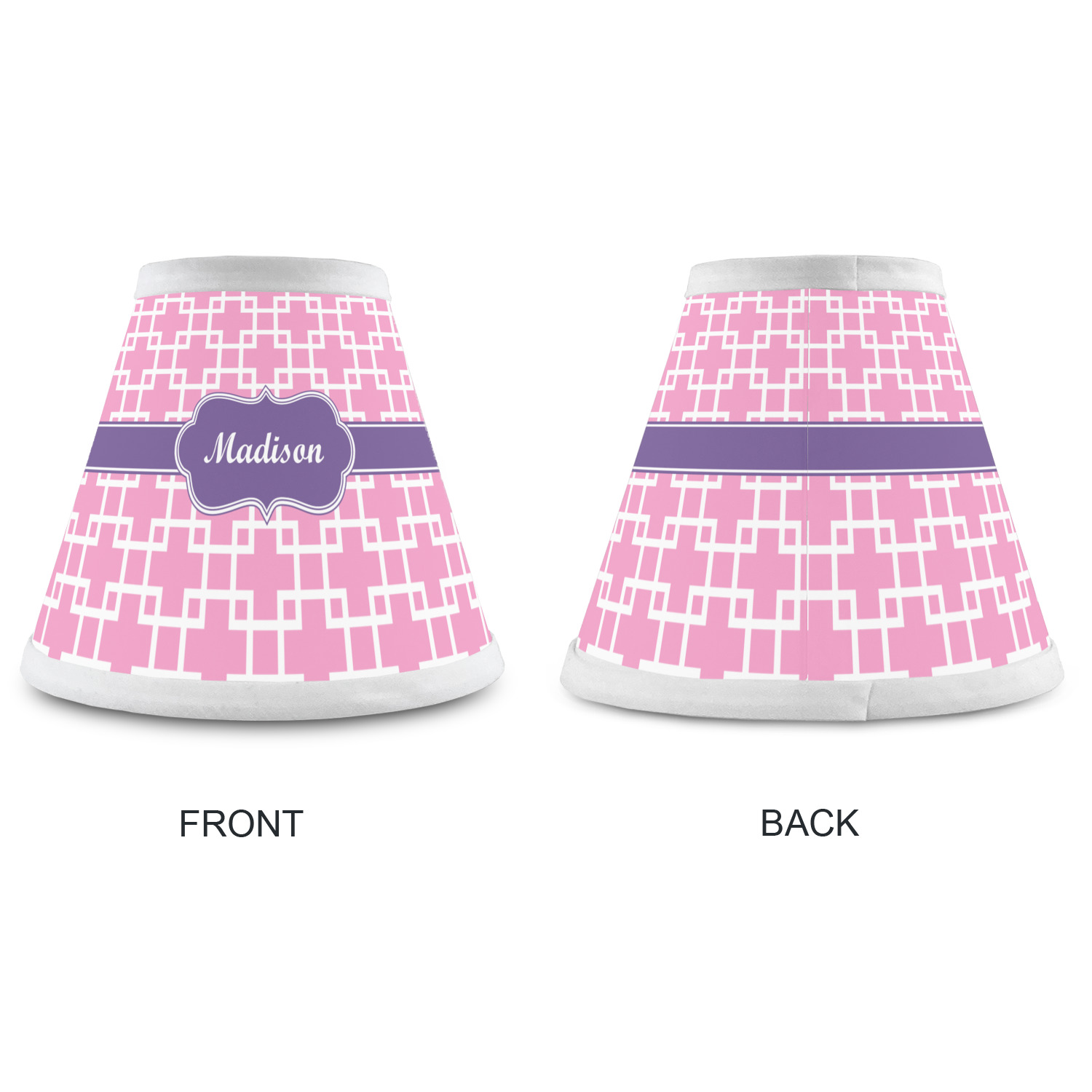 This design that is shown is a pink background with white squares, however it is available in multiple colors. We also chose to use a classic ribbon and a decorative rectangular label in purple. Ribbon and Labels are also available in multiple colors.