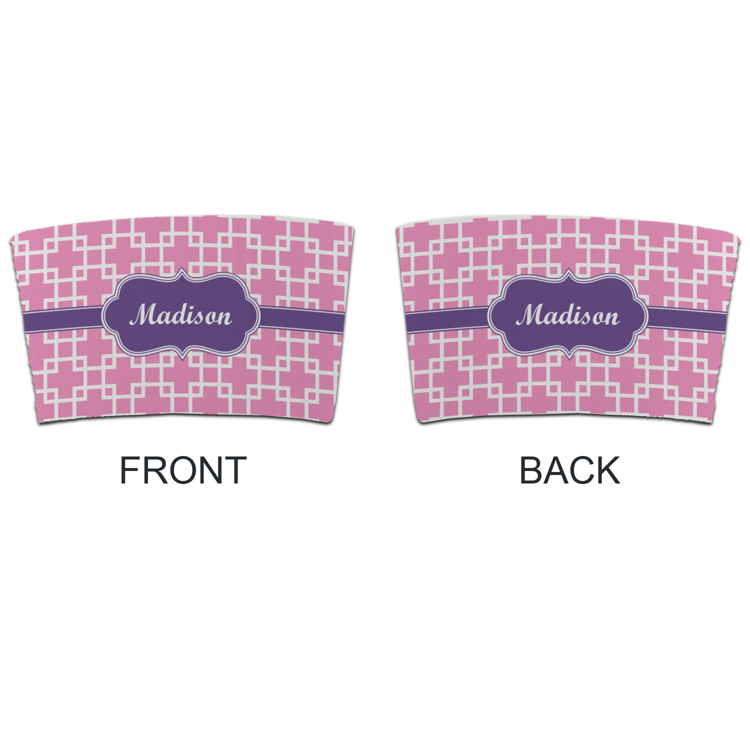 This design that is shown is a pink background with white squares, however it is available in multiple colors. We also chose to use a classic ribbon and a decorative rectangular label in purple. Ribbon and Labels are also available in multiple colors.