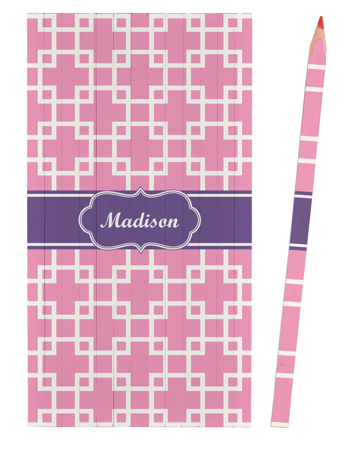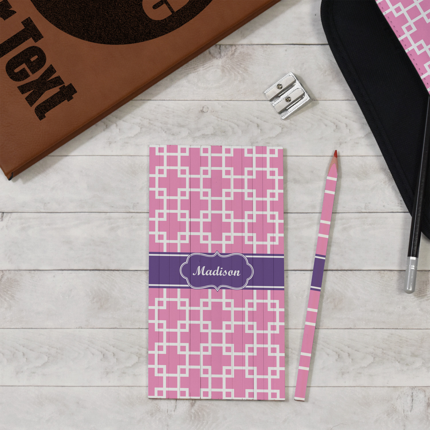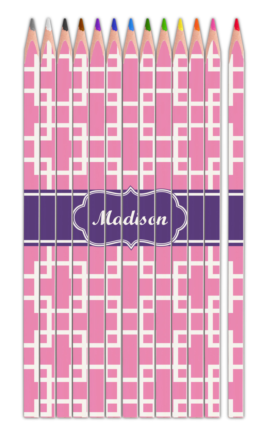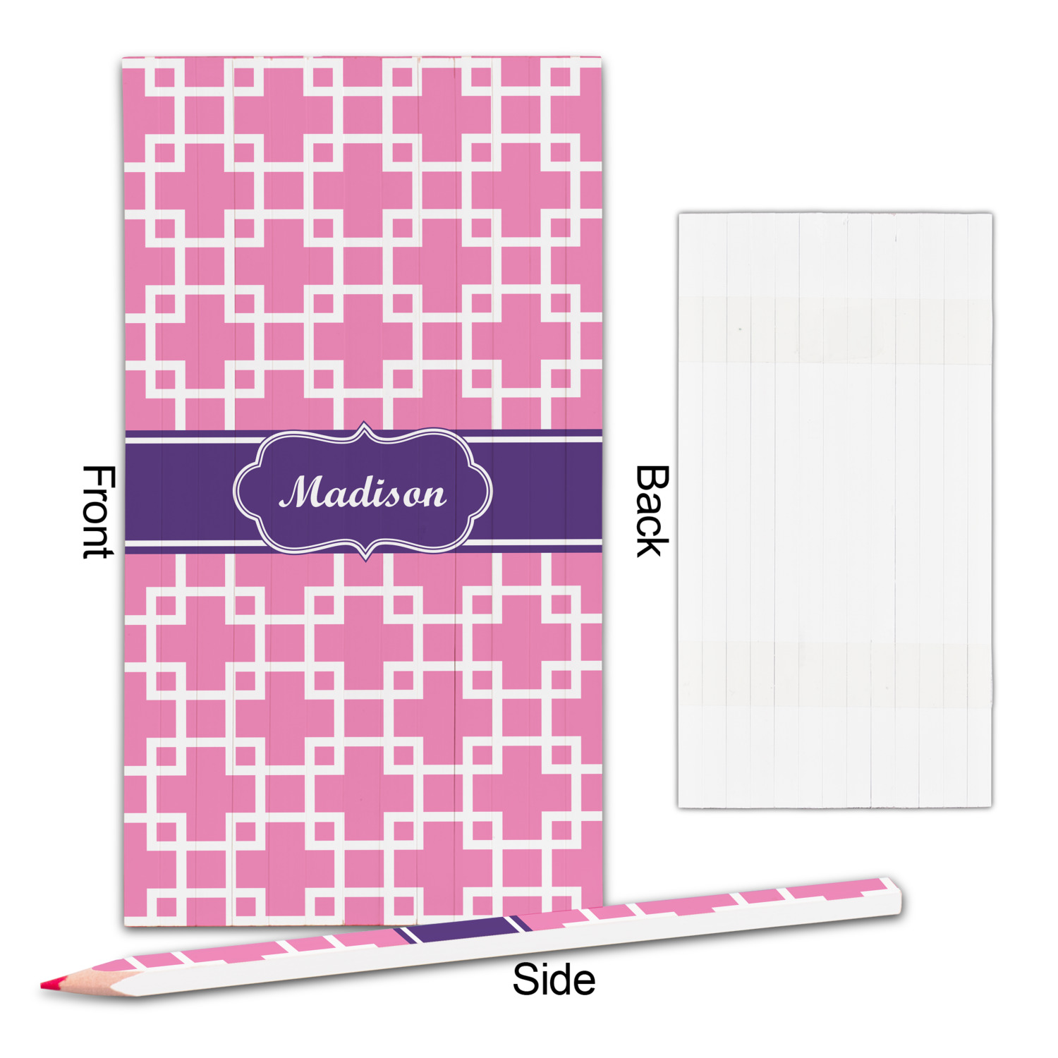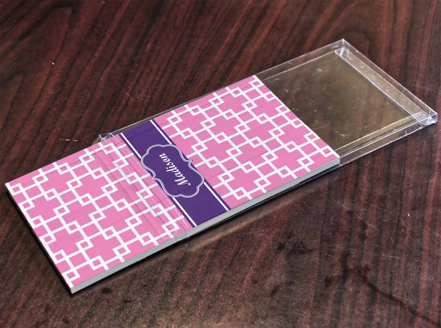 This design that is shown is a pink background with white squares, however it is available in multiple colors. We also chose to use a classic ribbon and a decorative rectangular label in purple. Ribbon and Labels are also available in multiple colors.