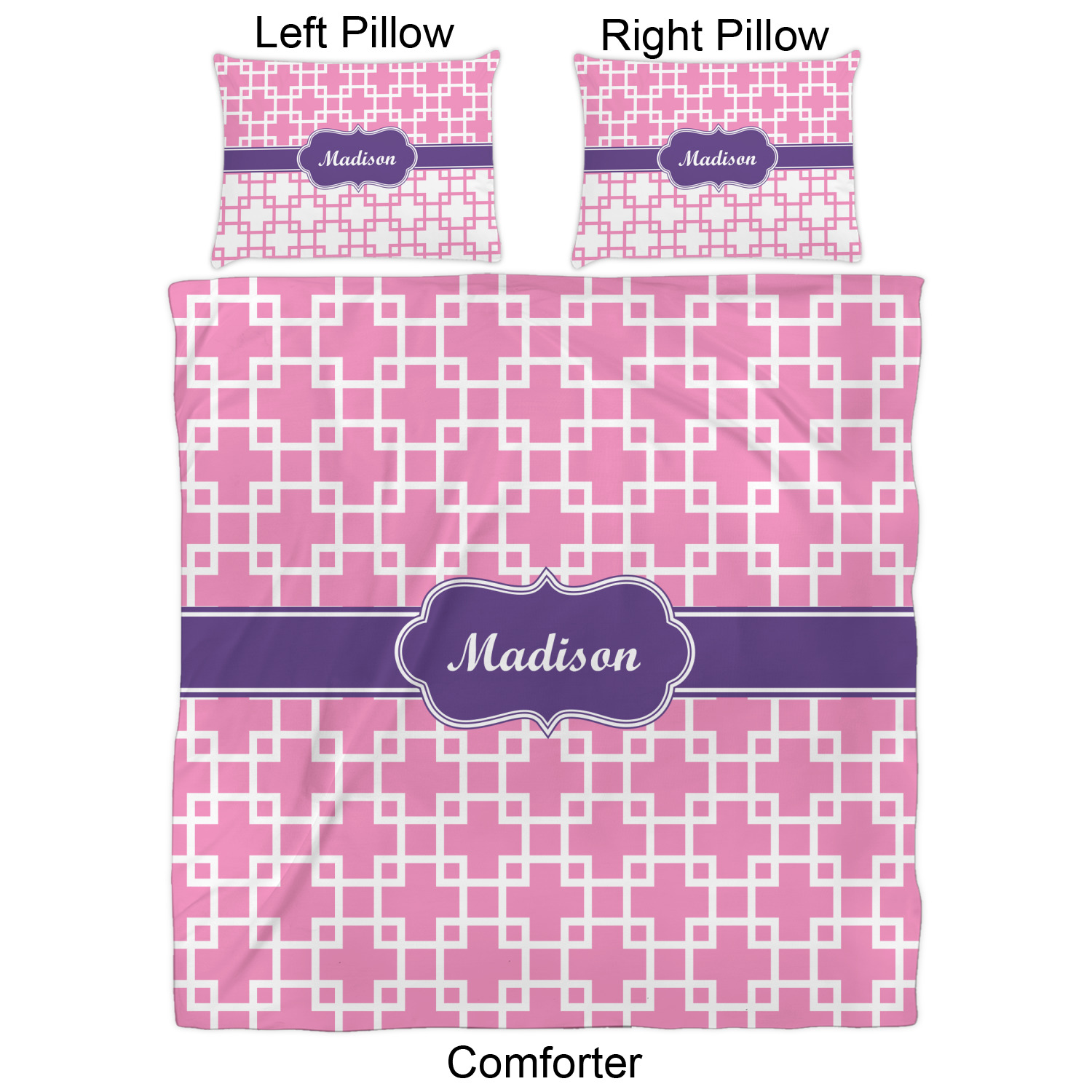 We have hundreds of different design templates for you to choose from Each design can be customized to your exact specifications. Not only can you customize the comforter, but you can also customize each pillow sham e.g. for a queen comforter set you have have Mr & Mrs pillow shams with the last name on comforter.