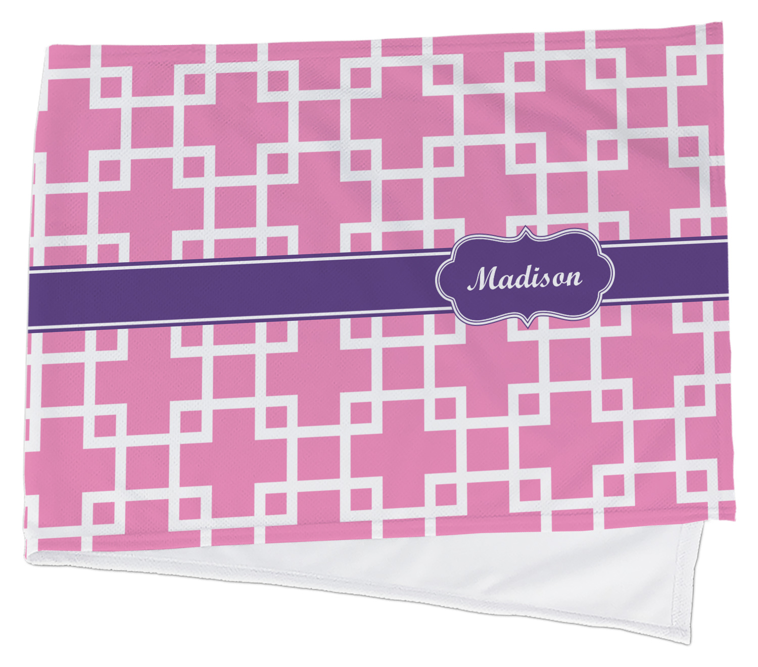 This design that is shown is a pink background with white squares, however it is available in multiple colors. We also chose to use a classic ribbon and a decorative rectangular label in purple. Ribbon and Labels are also available in multiple colors.