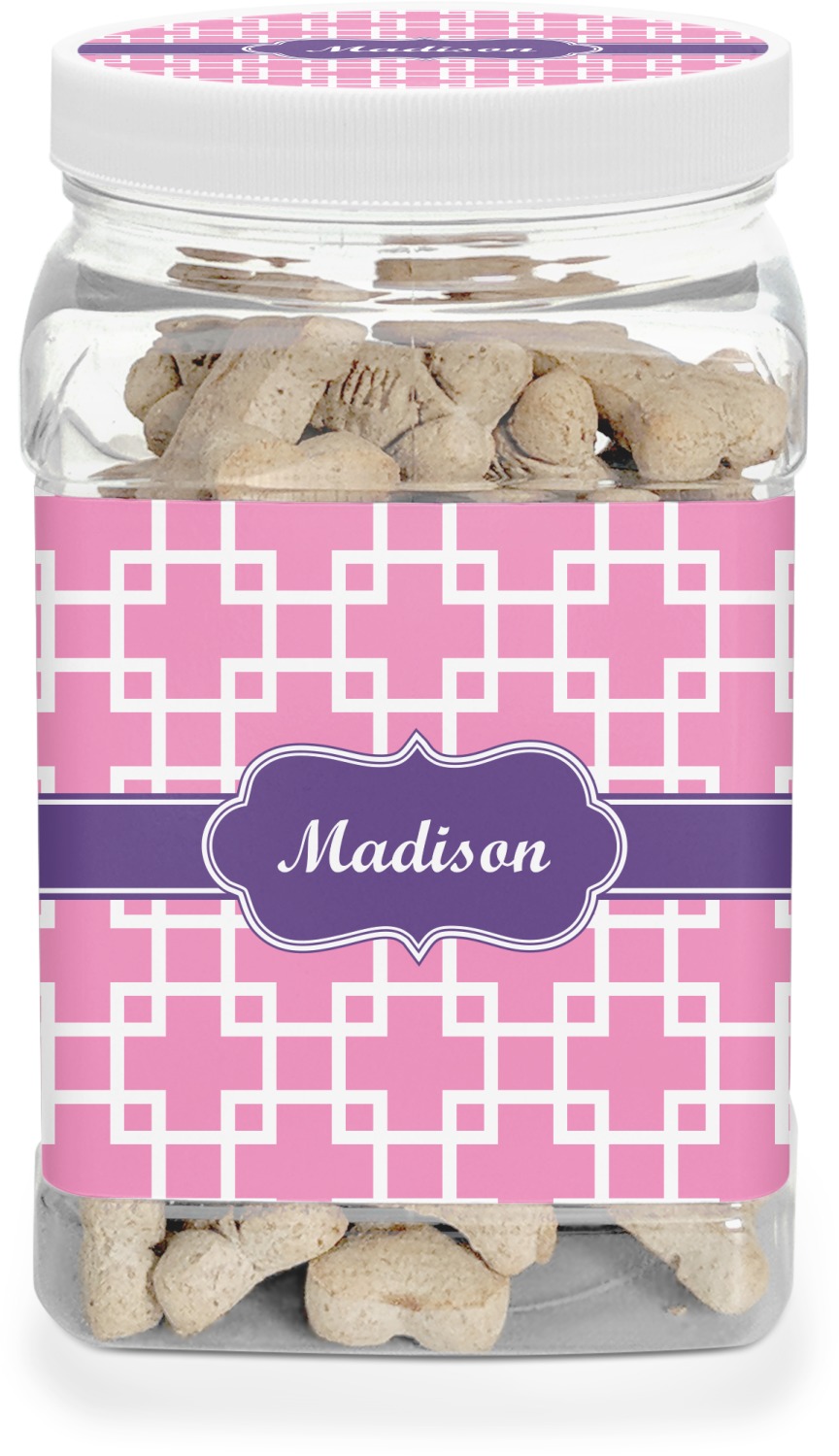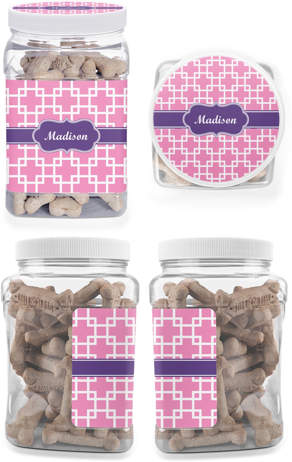 This half gallon jar, made from a sturdy plastic, is the perfect way to keep treats from any naughty pet paws, while still keeping them ready on hand for when your pup performs an impressive trick. This dog cookie jar features a screw-on, white lid that displays your personalized design on a vinyl sticker. We apply another customized sticker that wraps around the front and sides of the jar. Our dog treat jar also has indentations on the rear ends of the sides, which allows for convenient handling, and its square frame allows for easy storage.