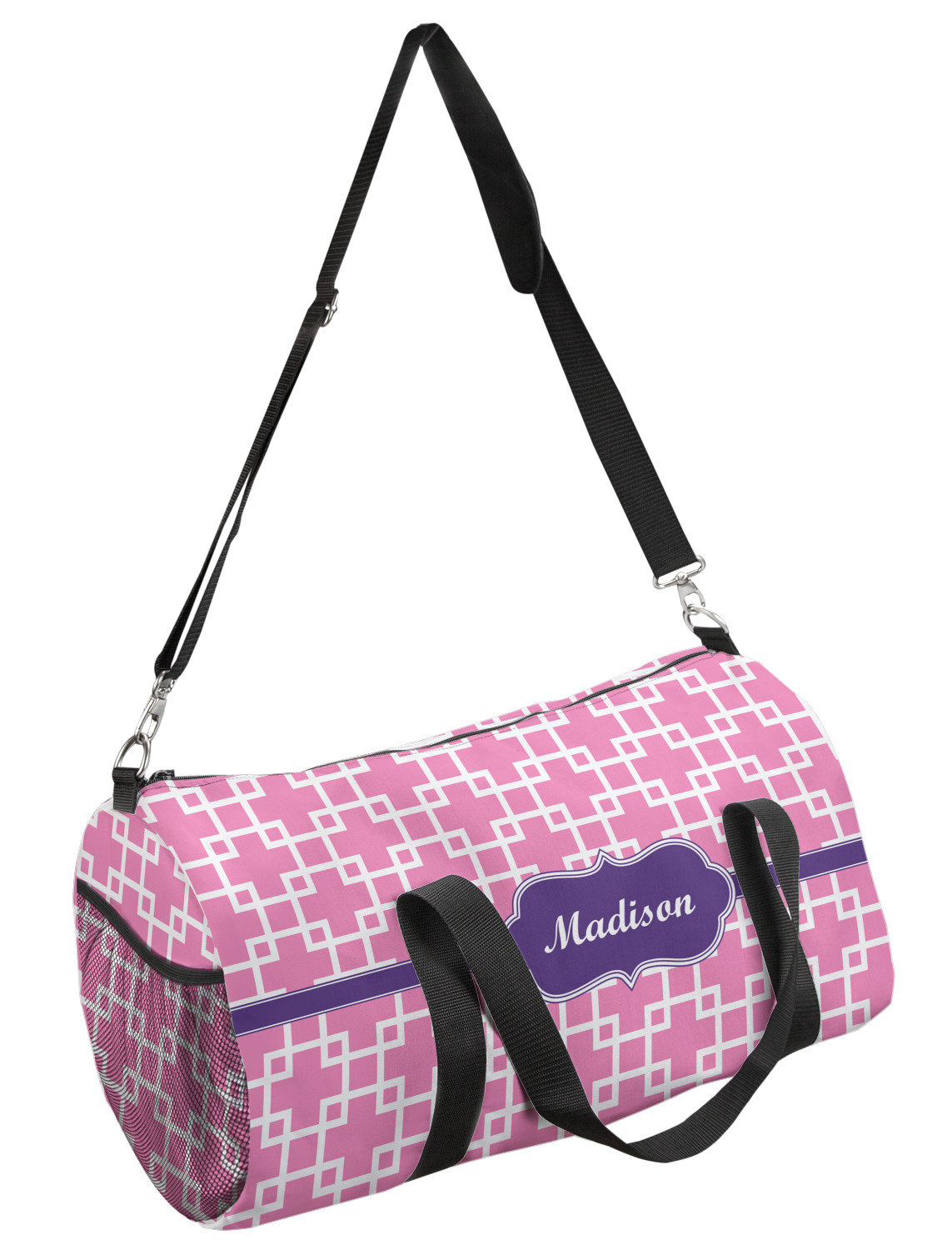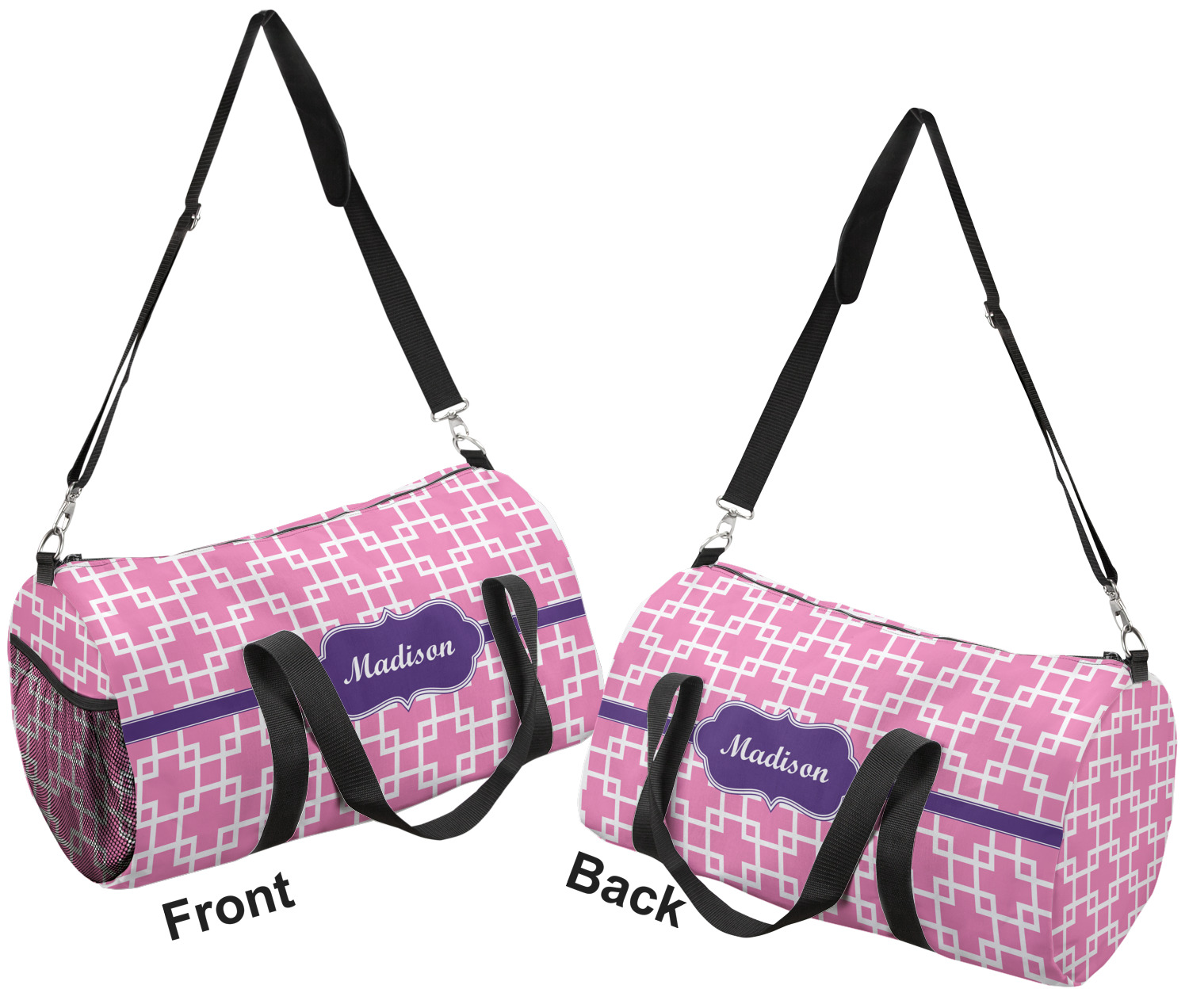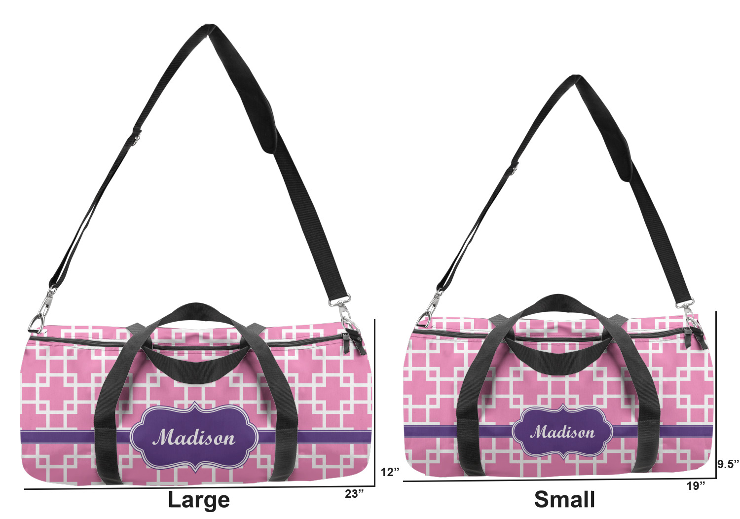 This duffle is a sturdy bag made of a canvas material. It comes in two sizes: Small (19"W x 9.5"H x 9.5"D) and Large (23"W x 12"H x 12"D). The bag is a cylindrical shape with a black adjustable strap and two handles. On one side is an elastic pouch to put a waterbottle or other small item. Your product will be sublimated with your design and is able to be designed on the front, back, and sides. Be sure to remember that the straps may cut into parts of your design if you upload your own artwork.