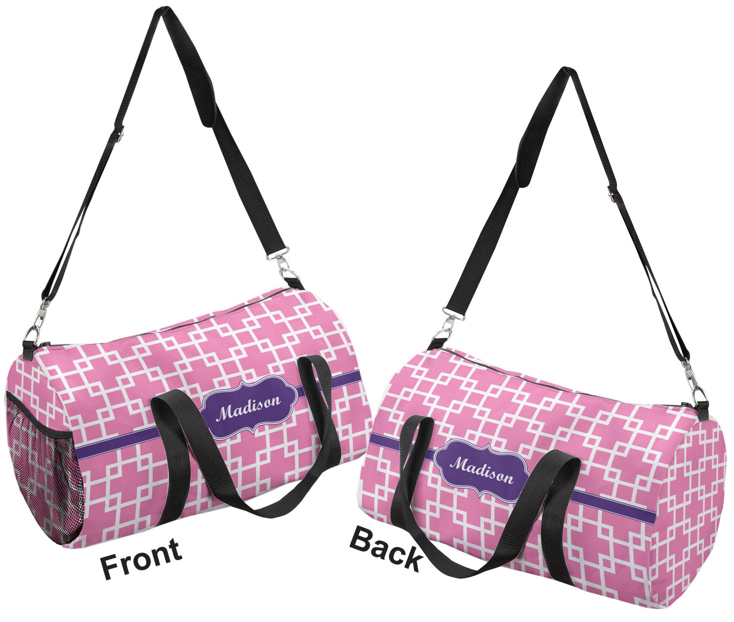 This duffle is a sturdy bag made of a canvas material. It comes in two sizes: Small (19"W x 9.5"H x 9.5"D) and Large (23"W x 12"H x 12"D). The bag is a cylindrical shape with a black adjustable strap and two handles. On one side is an elastic pouch to put a waterbottle or other small item. Your product will be sublimated with your design and is able to be designed on the front, back, and sides. Be sure to remember that the straps may cut into parts of your design if you upload your own artwork.