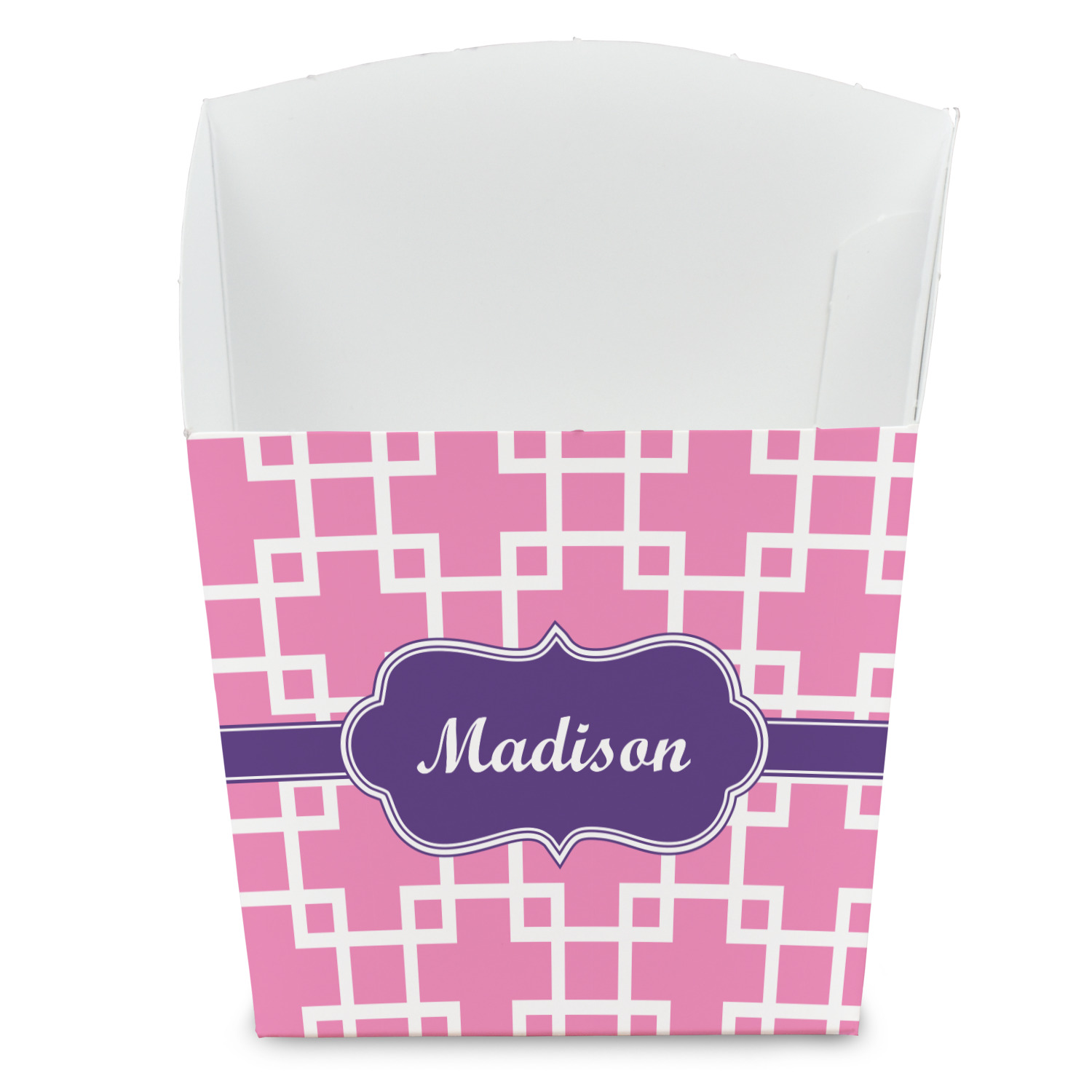 Since it is an open box, it works very well as a party snack cup (instead of plates) for different types of dry snacks and treats such as popcorn, cheezies, pretzels, chips, twizzlers, etc. This box can easily be carried with a drink all in one hand!