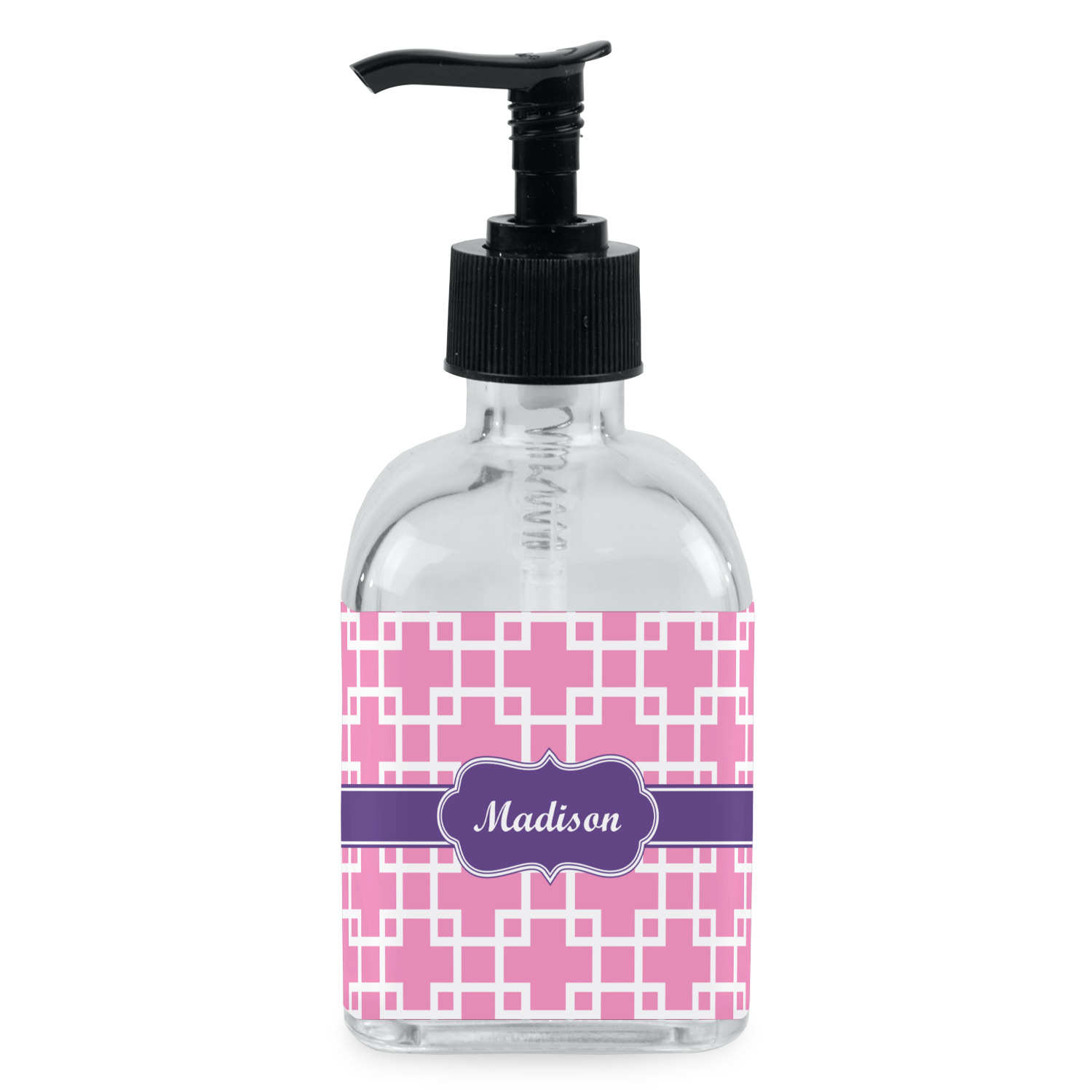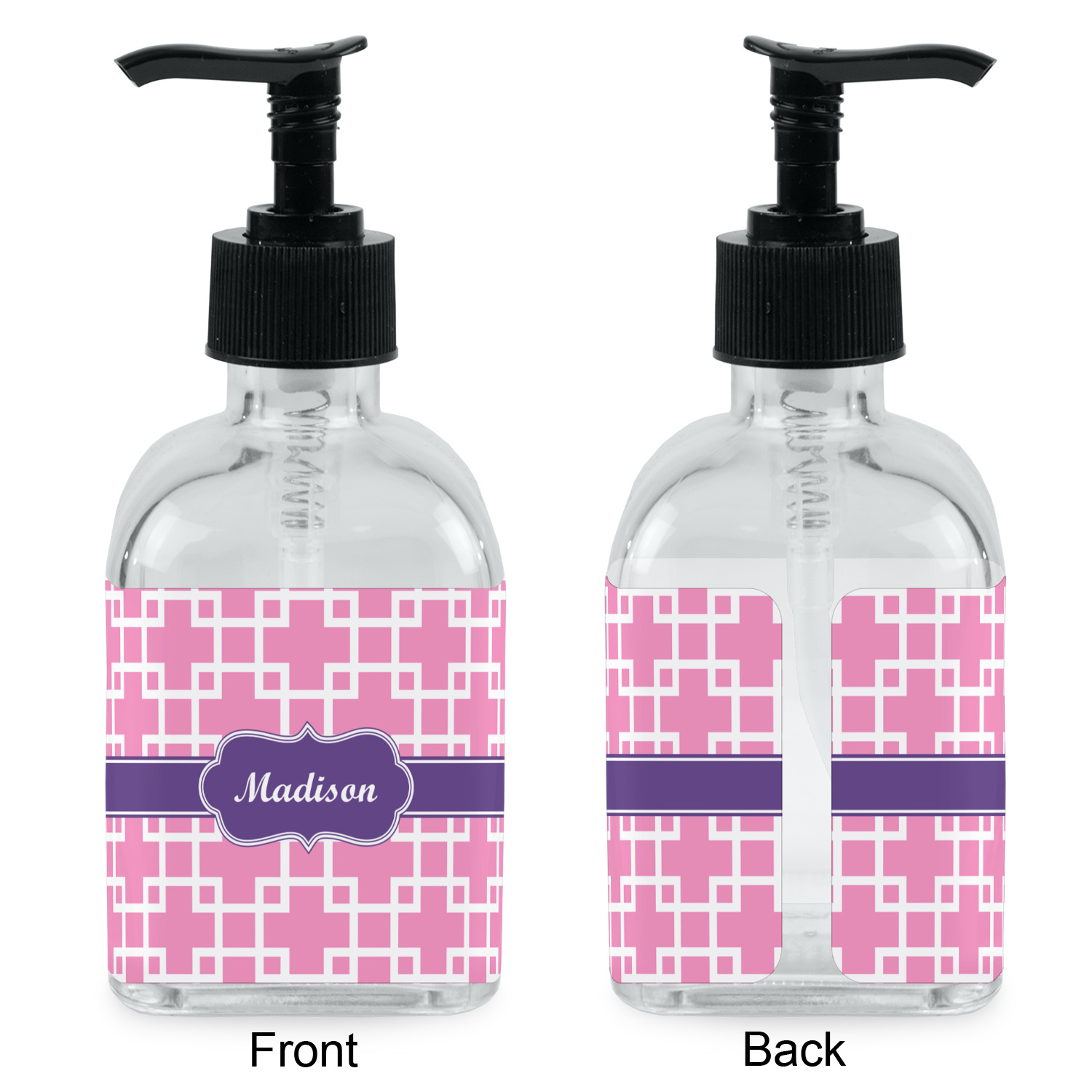 Crafted from a high-quality glass, these soap dispensers and lotion dispensers are durable and robust, while still looking elegant. They are sold with black pumps. Each soap dispenser pump measures at 6.5 by 2.25 inches. On these soap pumps, we display your customized design on a personalized vinyl adhesive on three sides. That way, you can judge how much liquid is in the bottles from the back.
