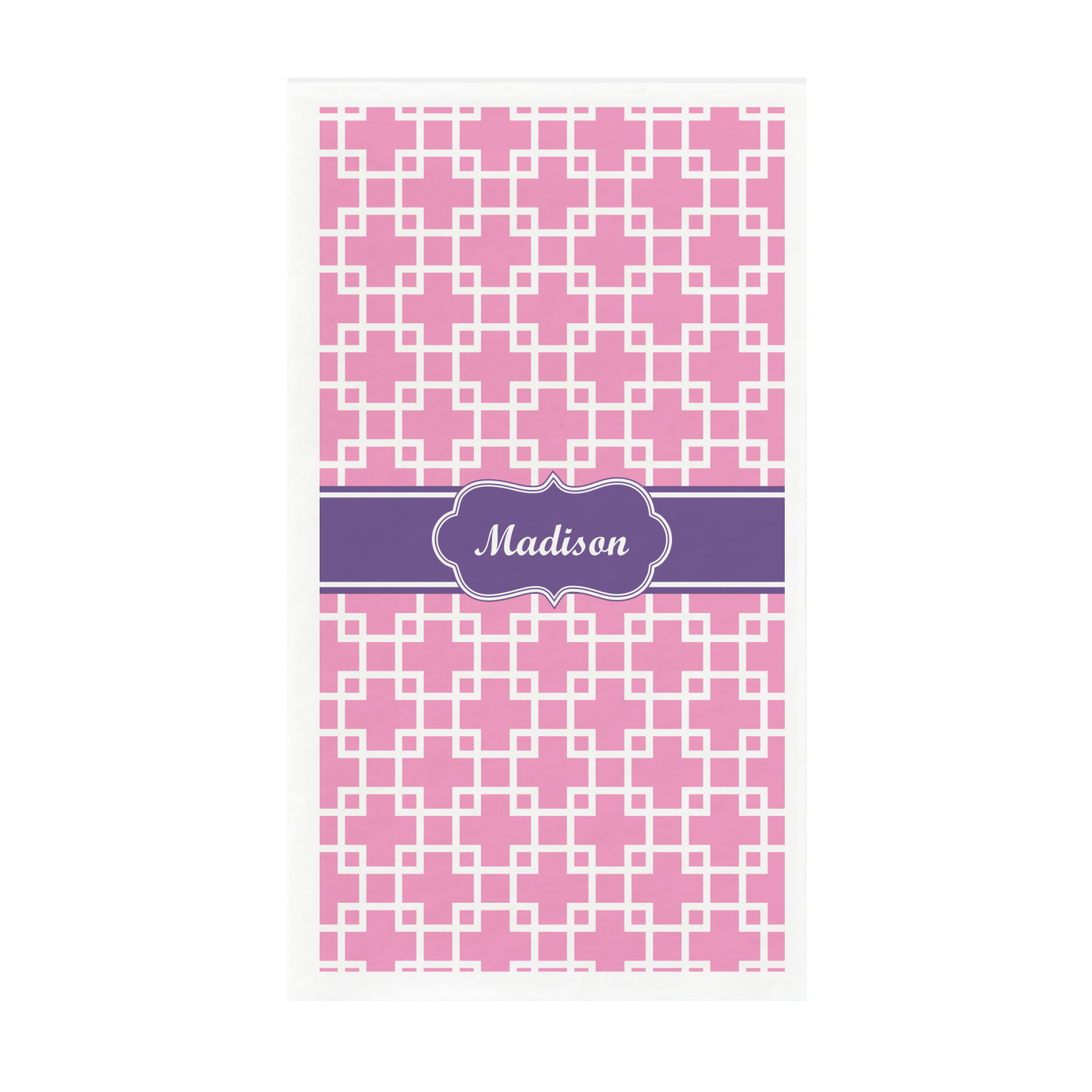 This design that is shown is a pink background with white squares, however it is available in multiple colors. We also chose to use a classic ribbon and a decorative rectangular label in purple. Ribbon and Labels are also available in multiple colors.