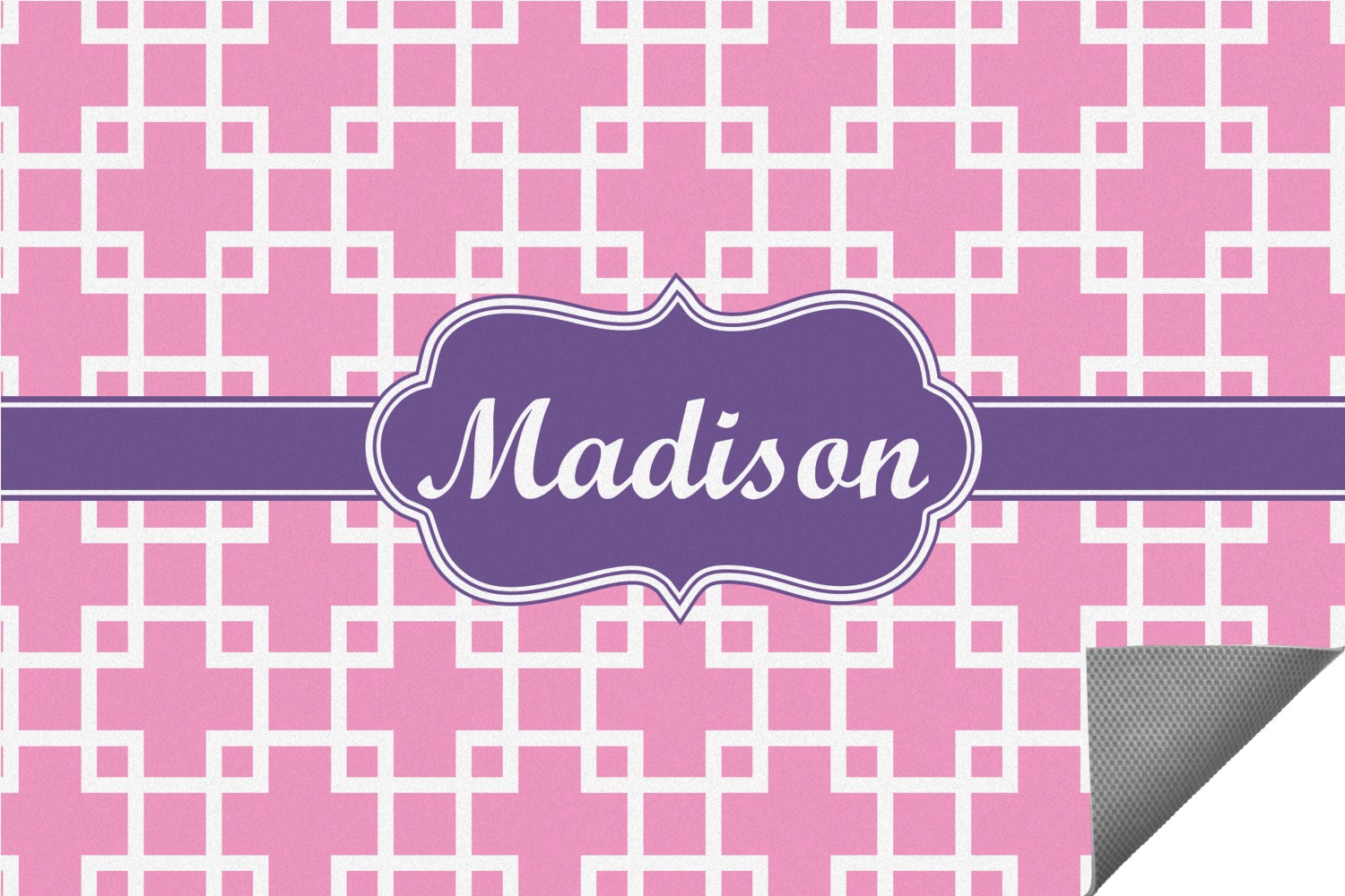 This design that is shown is a pink background with white squares, however it is available in multiple colors. We also chose to use a classic ribbon and a decorative rectangular label in purple. Ribbon and Labels are also available in multiple colors.