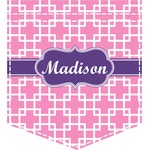 This design that is shown is a pink background with white squares, however it is available in multiple colors. We also chose to use a classic ribbon and a decorative rectangular label in purple. Ribbon and Labels are also available in multiple colors.