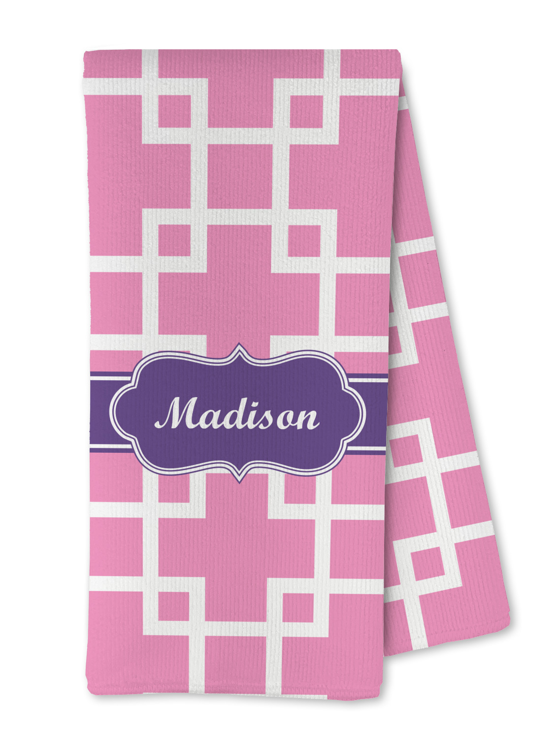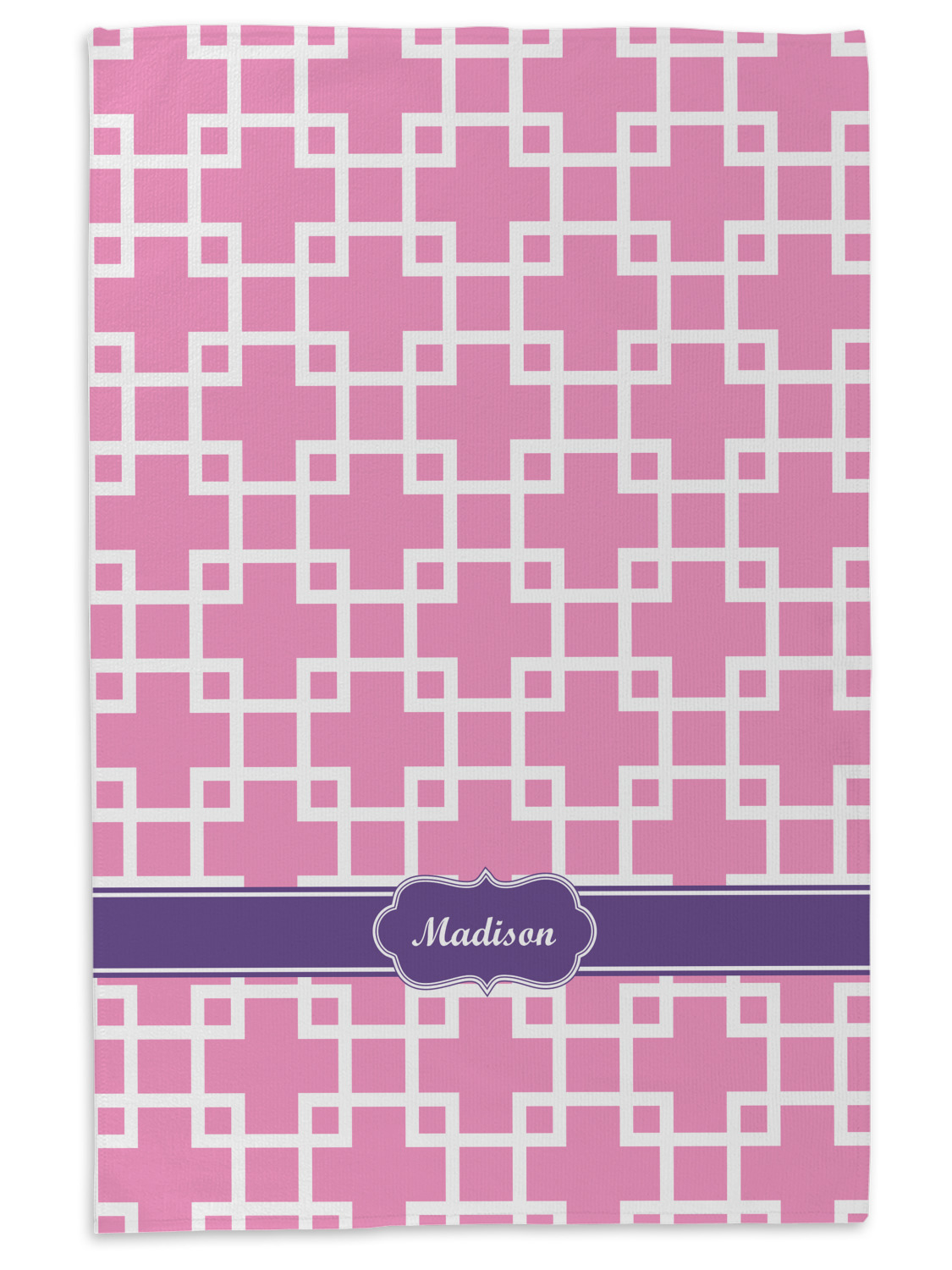 This design that is shown is a pink background with white squares, however it is available in multiple colors. We also chose to use a classic ribbon and a decorative rectangular label in purple. Ribbon and Labels are also available in multiple colors.