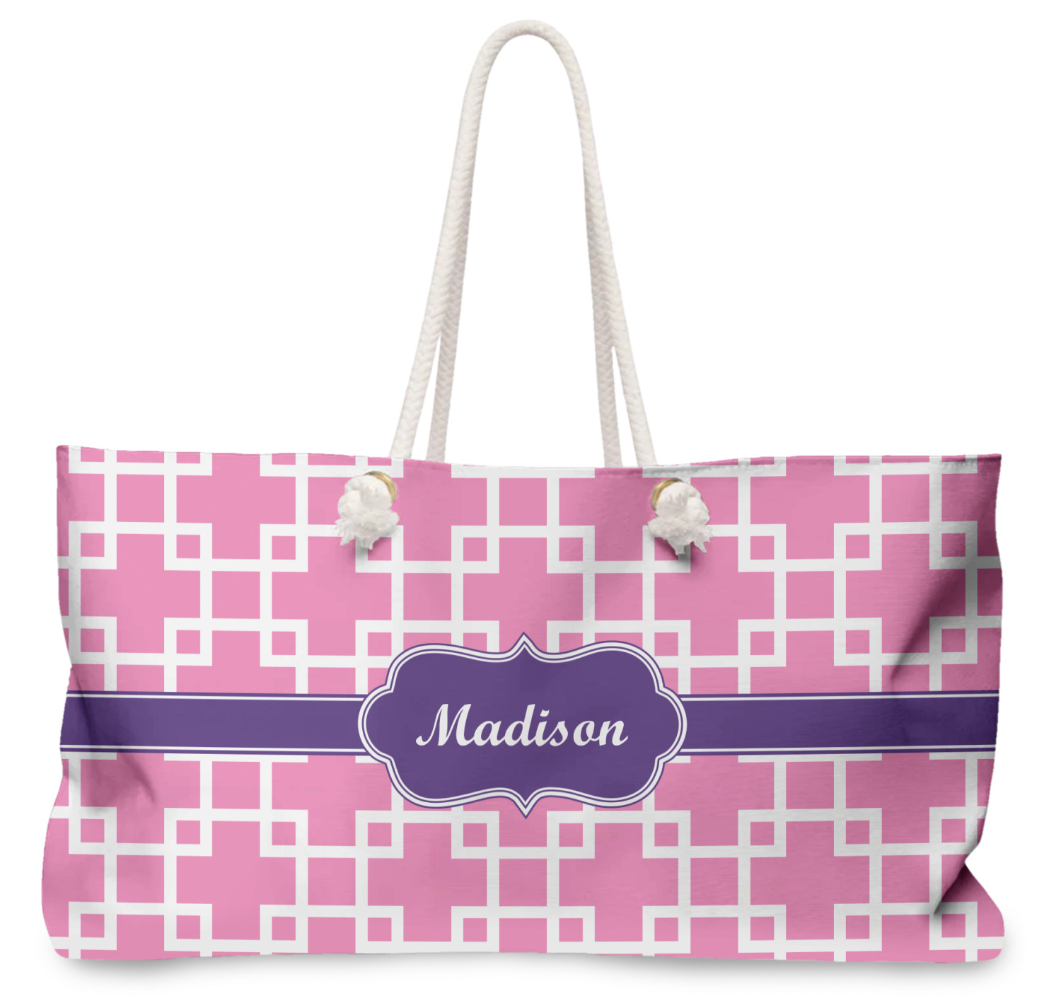 Our oversized weekender tote with rope handles is perfect for your weekend at the beach or on the town. This large tote are 24" W X 13" H, with a 5" gusset and a 27" thick rope handles with a knot that is put through a grommeted brass hole.