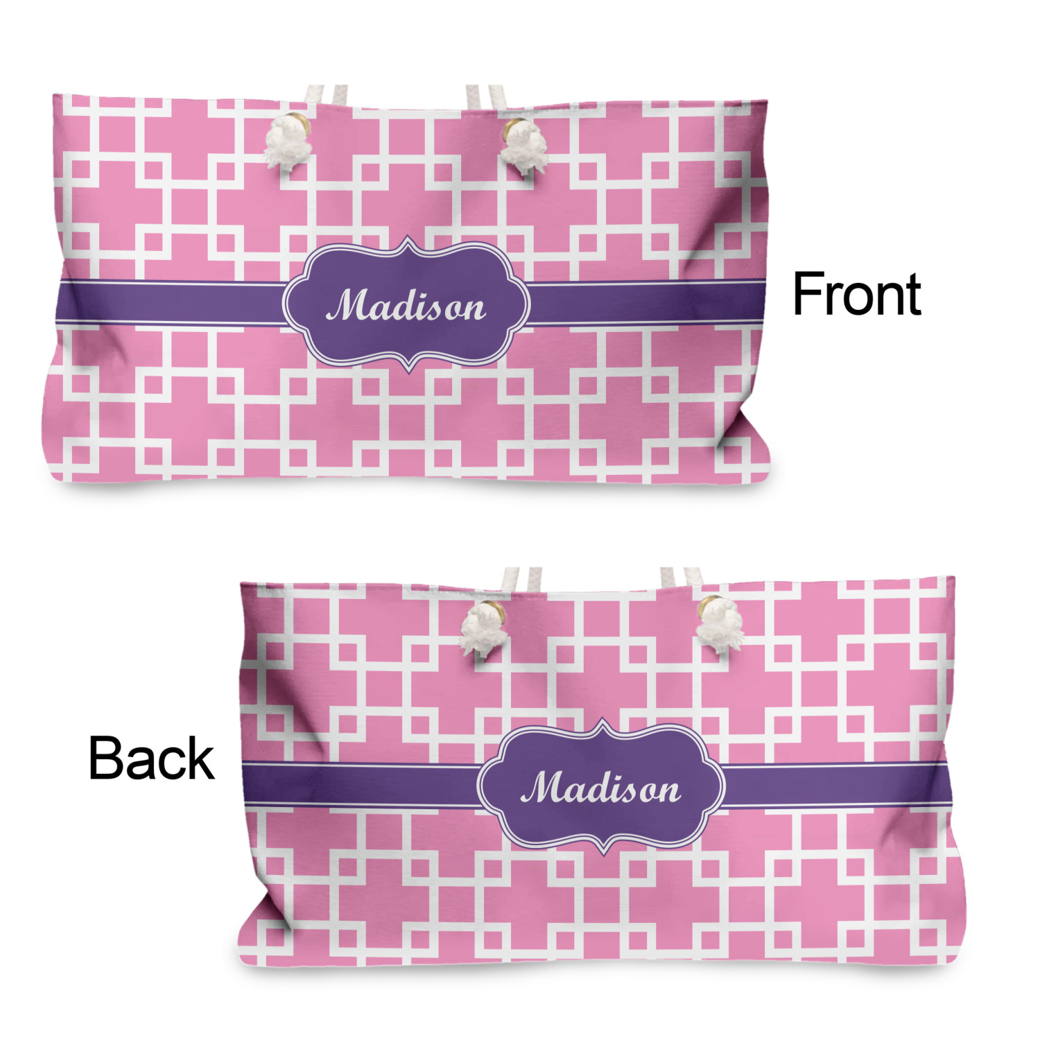 This design that is shown is a pink background with white squares, however it is available in multiple colors. We also chose to use a classic ribbon and a decorative rectangular label in purple. Ribbon and Labels are also available in multiple colors.