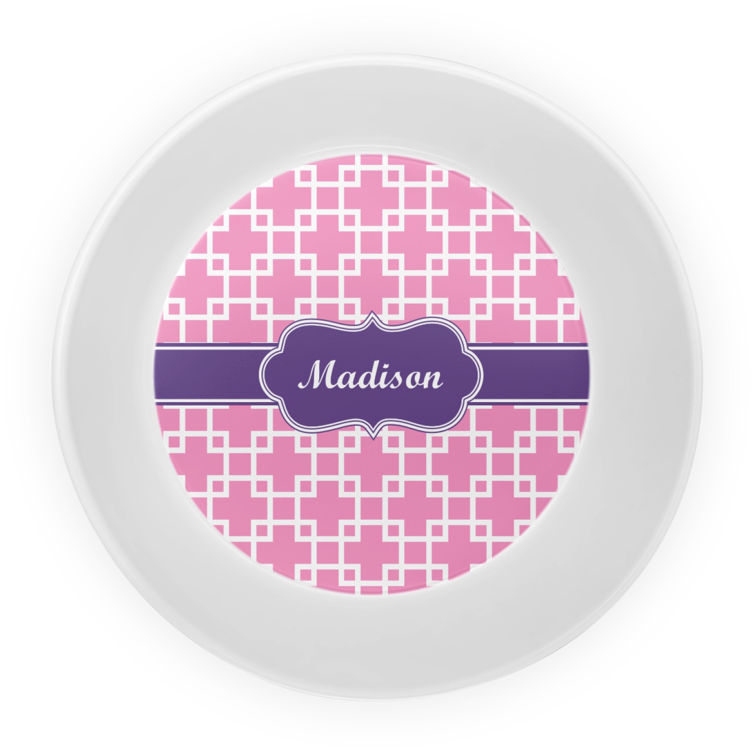 This design that is shown is a pink background with white squares, however it is available in multiple colors. We also chose to use a classic ribbon and a decorative rectangular label in purple. Ribbon and Labels are also available in multiple colors.
