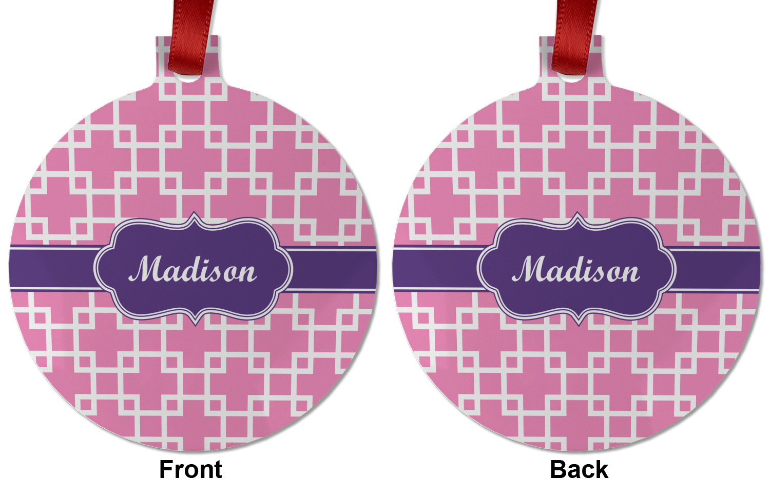 This design that is shown is a pink background with white squares, however it is available in multiple colors. We also chose to use a classic ribbon and a decorative rectangular label in purple. Ribbon and Labels are also available in multiple colors.