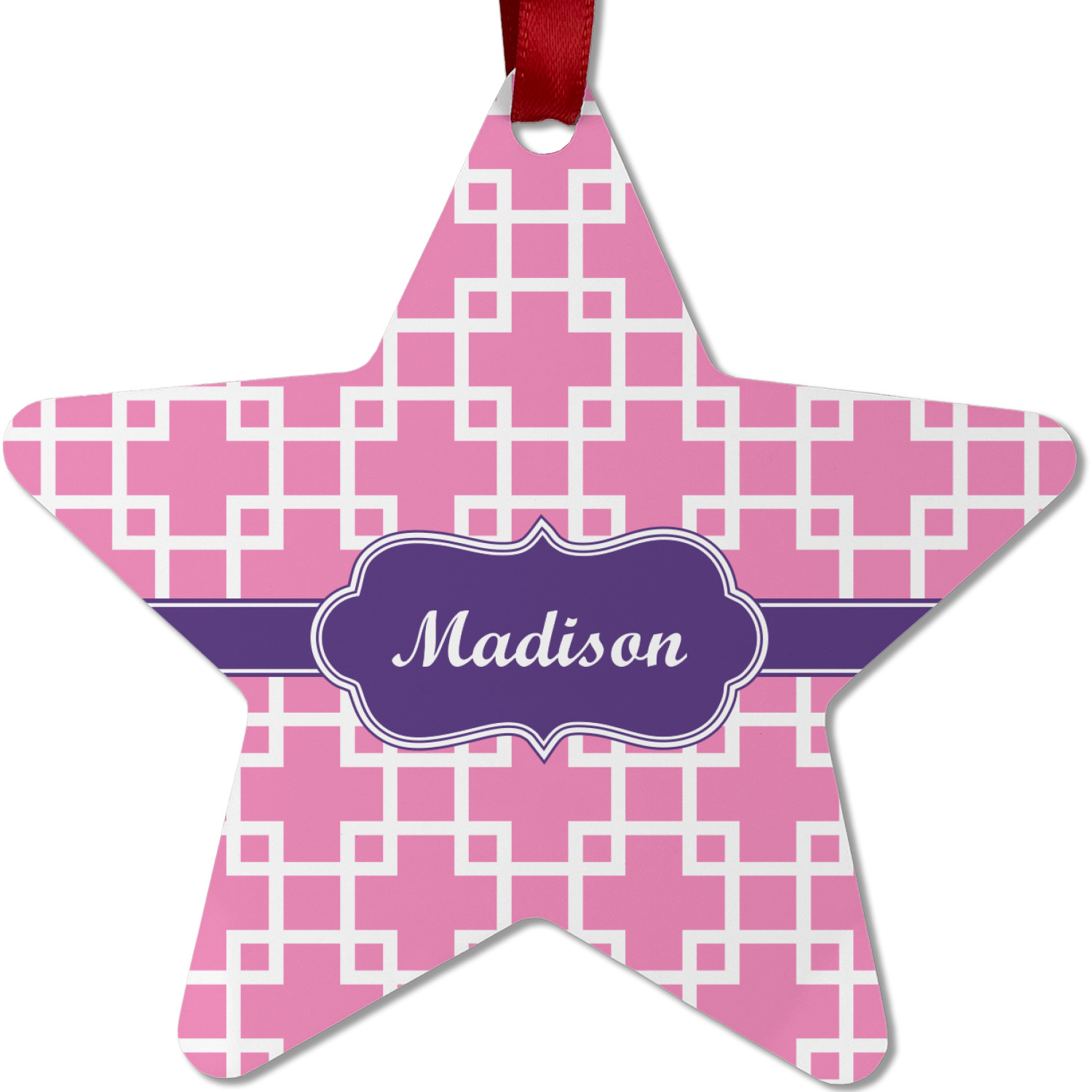 This design that is shown is a pink background with white squares, however it is available in multiple colors. We also chose to use a classic ribbon and a decorative rectangular label in purple. Ribbon and Labels are also available in multiple colors.