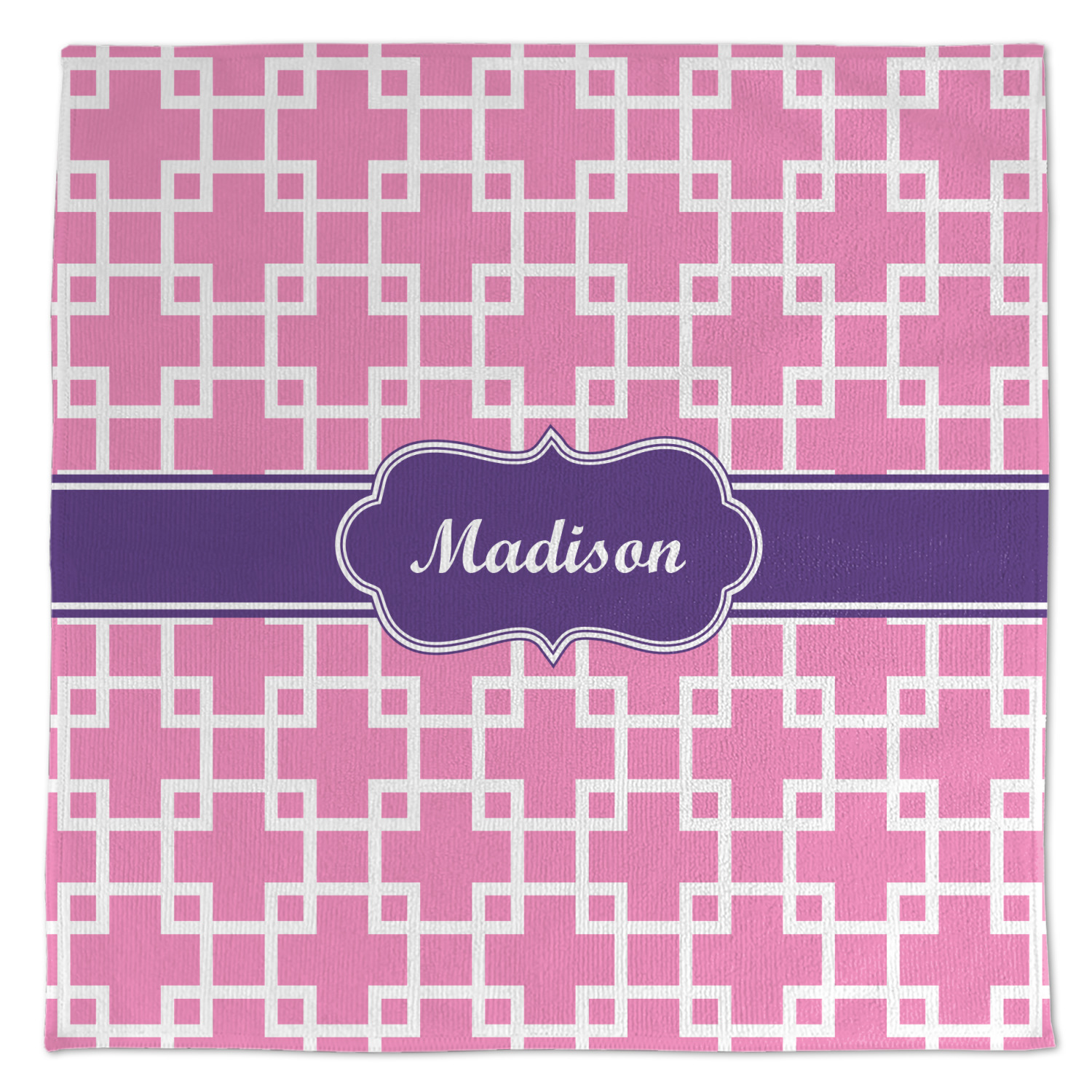 This design that is shown is a pink background with white squares, however it is available in multiple colors. We also chose to use a classic ribbon and a decorative rectangular label in purple. Ribbon and Labels are also available in multiple colors.