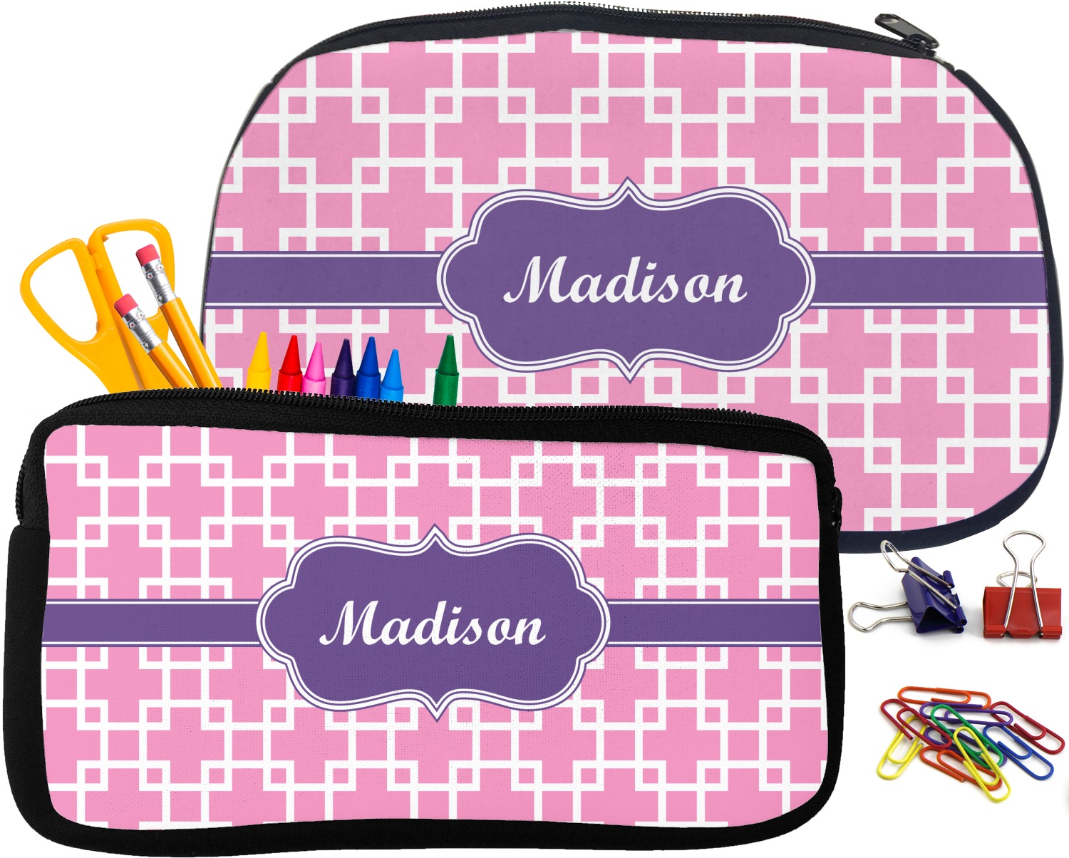 Built from durable neoprene, these pencil pouches, are water resistant, and prevent leaking ink from spilling into your backpack or purse. These custom pencil cases secure with a robust, black zipper. We print your personalized design on the front of this pouch, while the remaining sides a simple black color. These colored pencil cases [880] are sold in two sizes; our smaller version measures at 8.5 by 4.5 inches, while the medium measures at 10.5 by 6.5 inches. The smaller size is more suitable for holding pencils and pens, while our medium size can accommodate pencil sharpeners, scissors, and erasers.