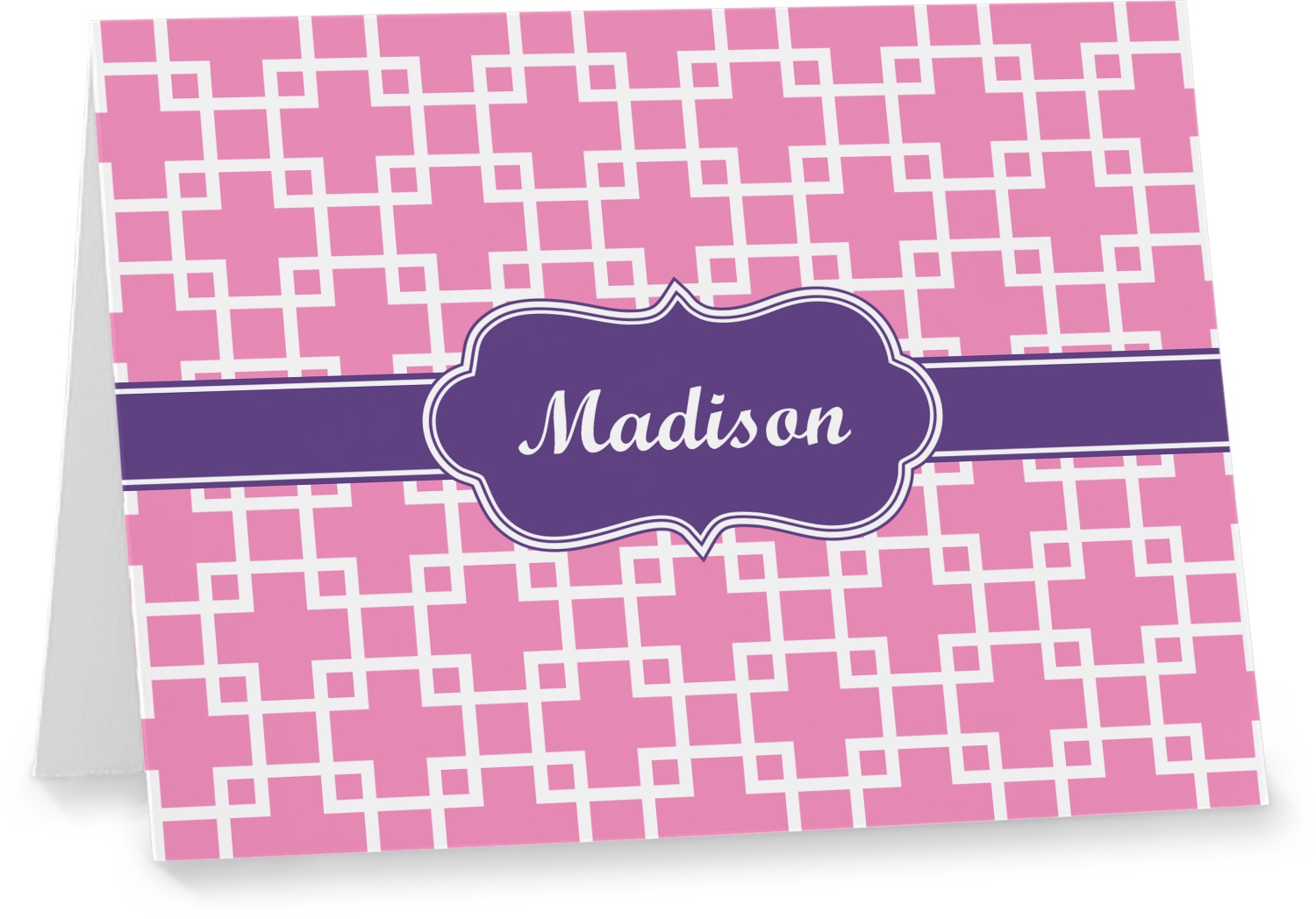This design that is shown is a pink background with white squares, however it is available in multiple colors. We also chose to use a classic ribbon and a decorative rectangular label in purple. Ribbon and Labels are also available in multiple colors.