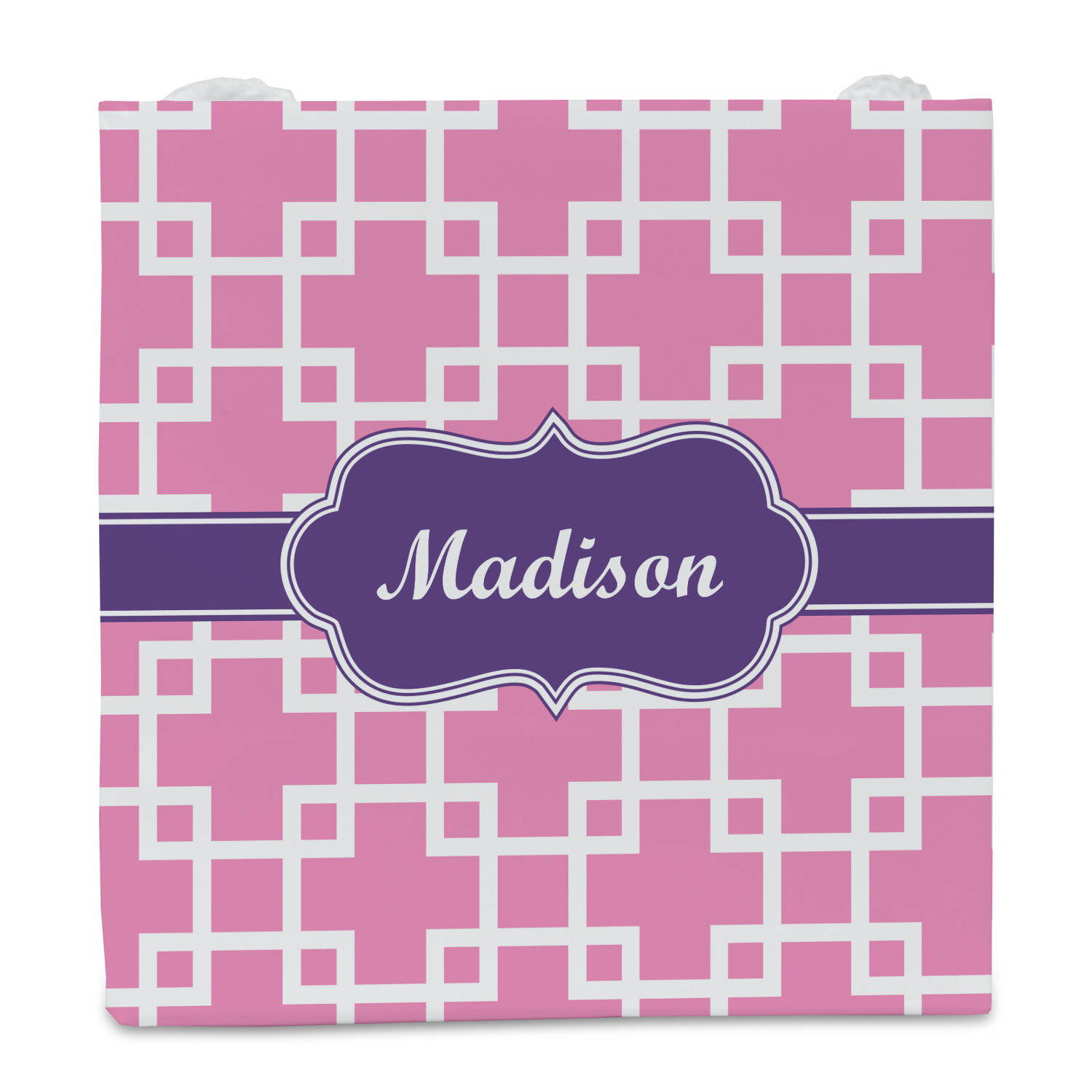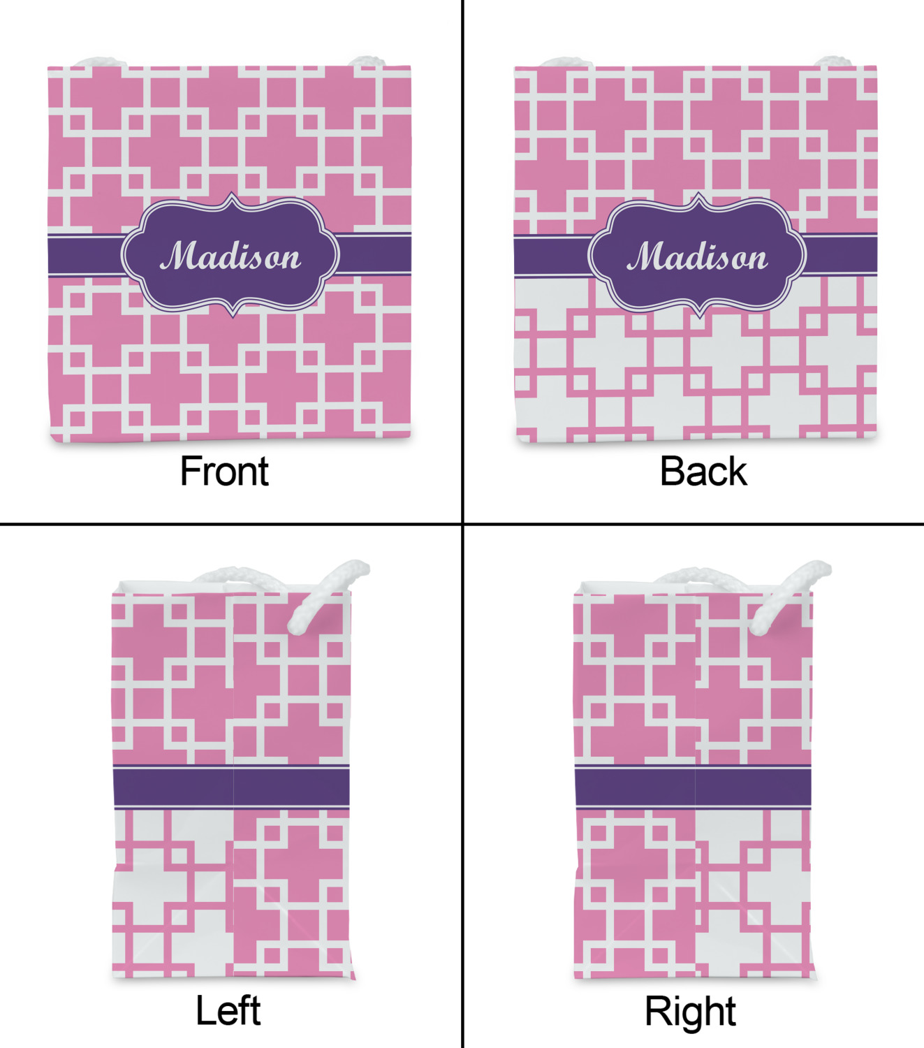 This design that is shown is a pink background with white squares, however it is available in multiple colors. We also chose to use a classic ribbon and a decorative rectangular label in purple. Ribbon and Labels are also available in multiple colors.