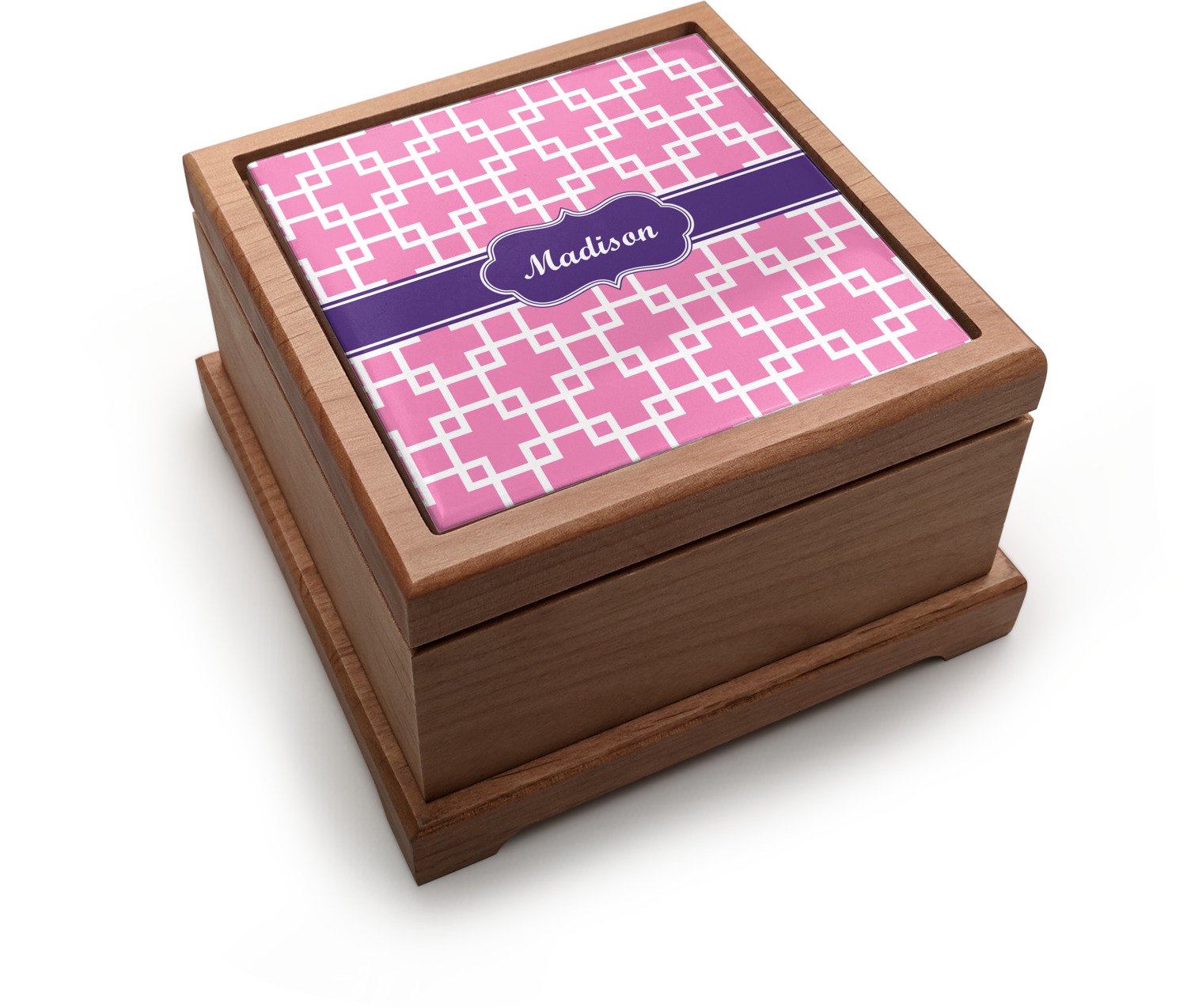 This design that is shown is a pink background with white squares, however it is available in multiple colors. We also chose to use a classic ribbon and a decorative rectangular label in purple. Ribbon and Labels are also available in multiple colors.