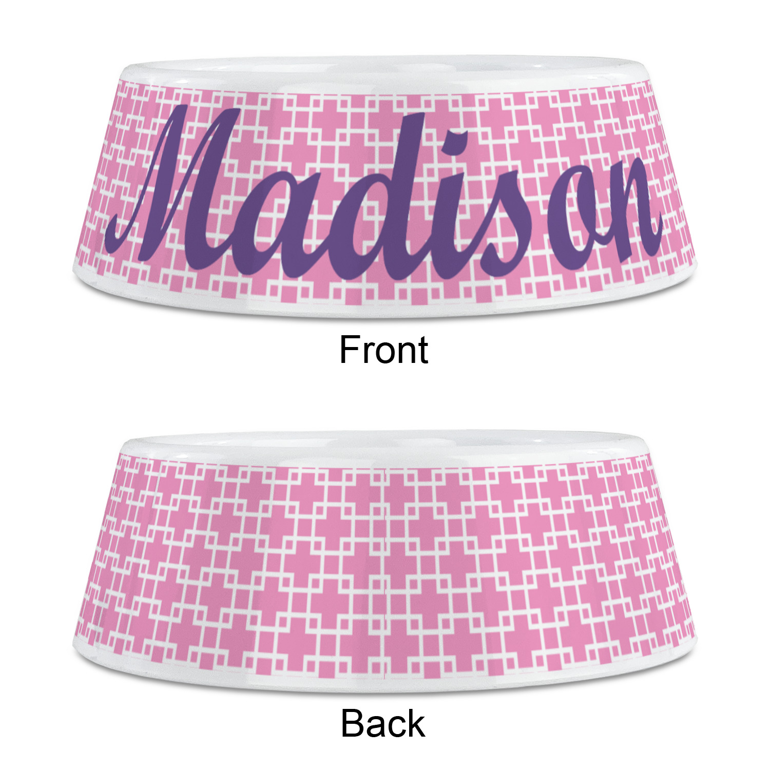 This design that is shown is a pink background with white squares, however it is available in multiple colors. We also chose to use a classic ribbon and a decorative rectangular label in purple. Ribbon and Labels are also available in multiple colors.