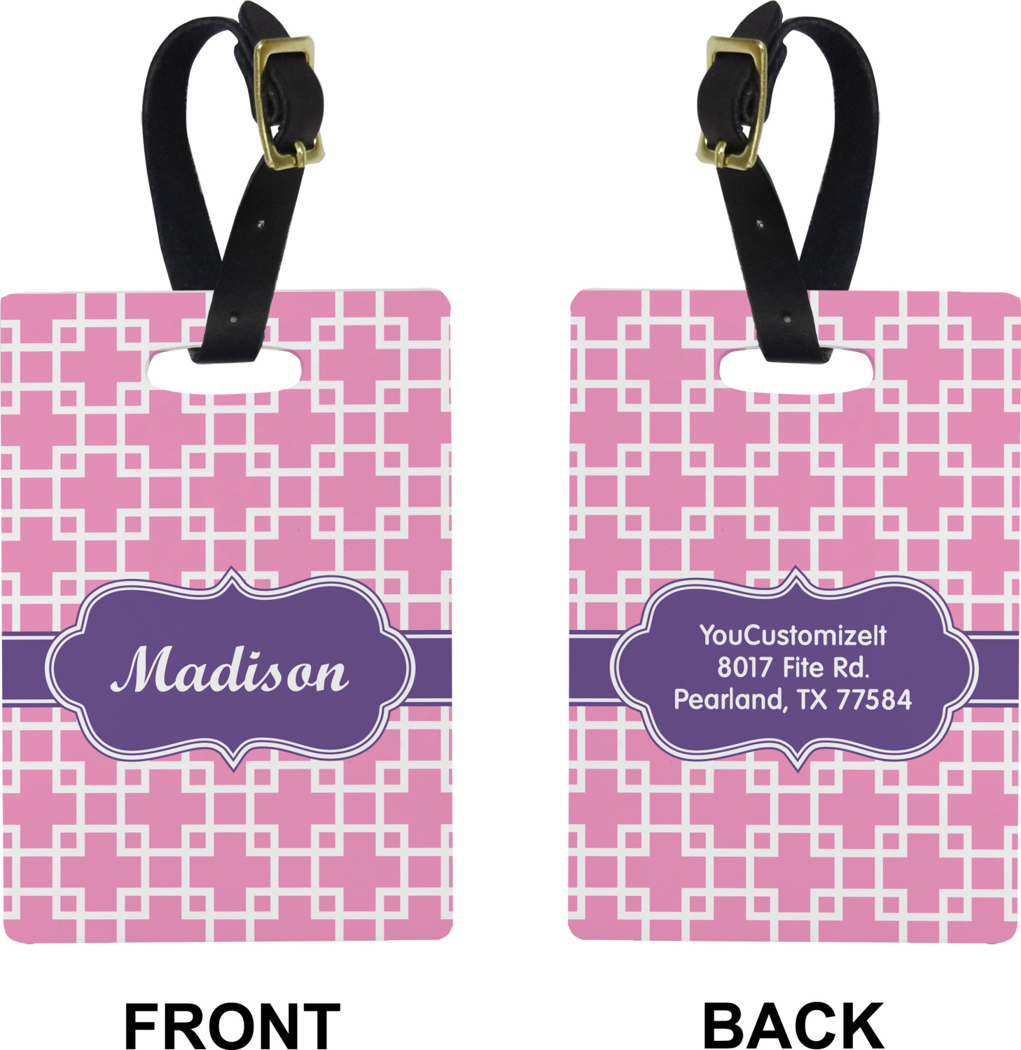 These cute luggage tags are made of a fiber-reinforced, UV-resistant plastic, making them waterproof and durable enough for both everyday use and the rugged adventures of any traveler! A leather strap with holes and a buckle is included with your purchase and can be used to attach your custom luggage tag to any suitcase, backpack, or duffel bag. You can design these travel tags as you wish; your customization will be displayed across the front, while the back will show as little or as much personal information as you want.